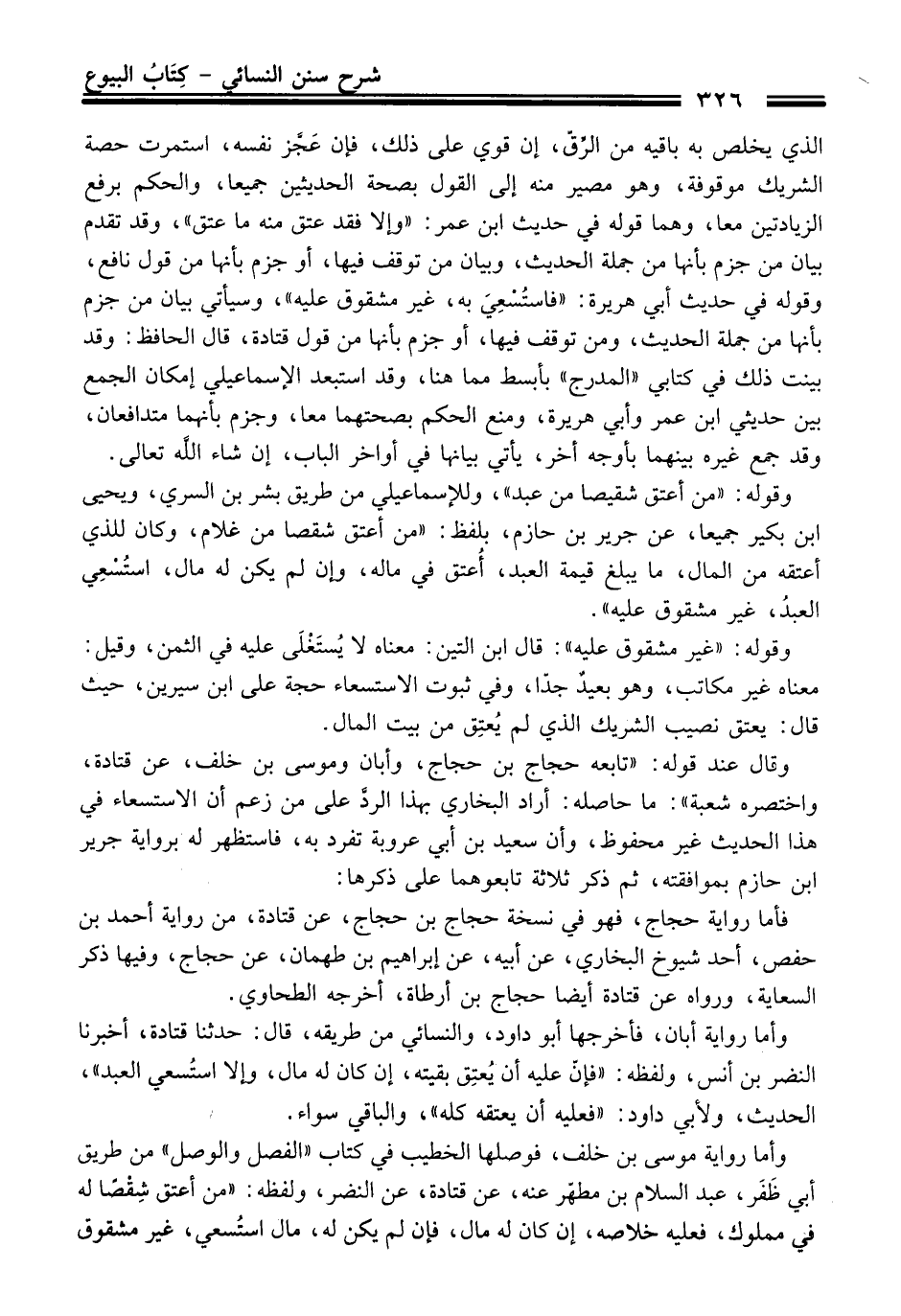 الذي يخلص به باقيه منْ الرِّقّ، إن قوي عَلَى ذلك، فإن عَجَّز نفسه، استمرت حصة الشريك موقوفة، وهو مصير منه إلى القول بصحة الحديثين جميعا، والحكم برفع الزيادتين معا، وهما قوله فِي حديث ابن عمر: "وإلا فقد عتق منه ما عتق"، وَقَدْ تقدم بيان منْ جزم بأنها منْ جملة الْحَدِيث، وبيان منْ توقف فيها، أو جزم بأنها منْ قول نافع، وقوله فِي حديث أبي هريرة: "فاستُسْعِيَ به، غير مشقوق عليه"، وسيأتي بيان منْ جزم بأنها منْ جملة الْحَدِيث، ومن توقف فيها، أو جزم بأنها منْ قول قتادة، قَالَ الحافظ: وَقَدْ بينت ذلك فِي كتابي "المدرج" بأبسط مما هنا، وَقَدْ استبعد الإسماعيلي إمكان الجمع بين حديثي ابن عمر وأبي هريرة، ومنع الحكم بصحتهما معا، وجزم بأنهما متدافعان، وَقَدْ جمع غيره بينهما بأوجه أخر، يأتي بيانها فِي أواخر الباب، إن شاء الله تعالى.