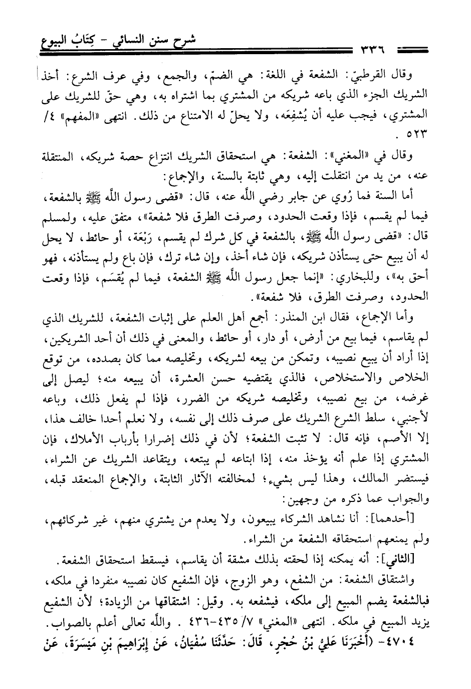 أما السنة فما رُوي عن جابر رضي الله عنه، قَالَ: "قضى رسول الله -صلى الله عليه وسلم- بالشفعة، فيما لم يقسم، فإذا وقعت الحدود، وصرفت الطرق فلا شفعة"، متَّفقٌ عليه، ولمسلم قَالَ: "قضى رسول الله -صلى الله عليه وسلم-، بالشفعة فِي كل شرك لم يقسم، رَبْعَة، أو حائط، لا يحل له أن يبيع حَتَّى يستأذن شريكه، فإن شاء أخذ، وإن شاء ترك، فإن باع ولم يستأذنه، فهو أحق به"، وللبخاري: "إنما جعل رسول الله -صلى الله عليه وسلم- الشفعة، فيما لم يُقسَم، فإذا وقعت الحدود، وصرفت الطرق، فلا شفعة".