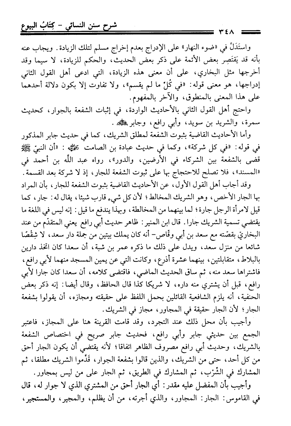 واستَدَلَّ فِي "ضوء النهار" عَلَى الإدراج بعدم إخراج مسلم لتلك الزيادة. ويجاب عنه بأنه قد يَقتَصِر بعض الأئمة عَلَى ذكر بعض الْحَدِيث، والحكم للزيادة، لاسيما وَقَدْ أخرجها مثل البخاريّ، عَلَى أن معنى هذه الزيادة، التي ادعى أهل القول الثاني إدراجها، هو معنى قوله: "فِي كُلِّ ما لم يقسم"، ولا تفاوت إلا بكون دلالة أحدهما عَلَى هَذَا المعنى بالمنطوق، والآخر بالمفهوم.