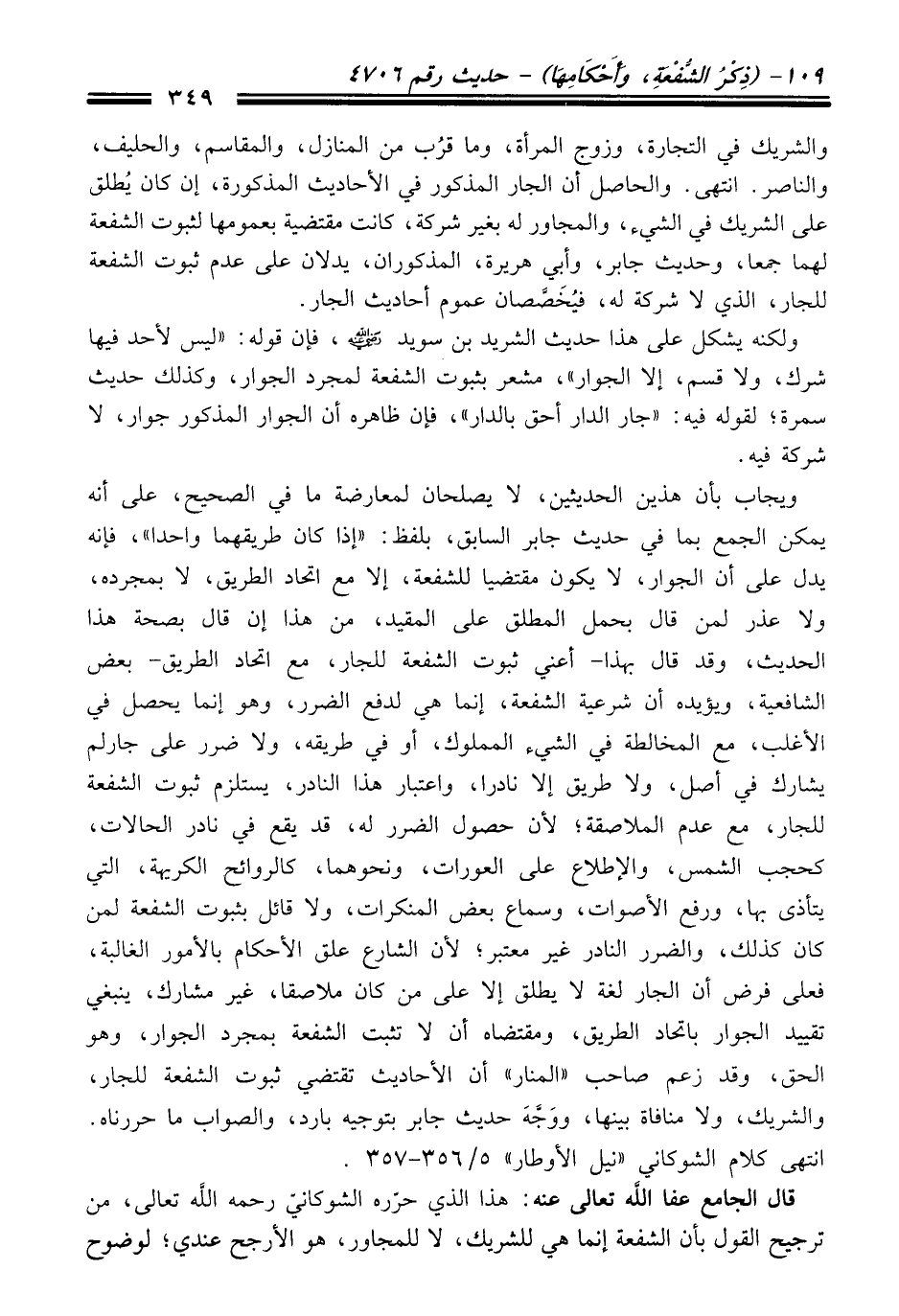 ويجاب بأن هذين الحديثين، لا يصلحان لمعارضة ما فِي الصحيح، عَلَى أنه يمكن الجمع بما فِي حديث جابر السابق، بلفظ: "إذا كَانَ طريقهما واحدا"، فإنه يدل عَلَى أن الجوار، لا يكون مقتضيا للشفعة، إلا مع اتحاد الطريق، لا بمجرده، ولا عذر لمن قَالَ بحمل المطلق عَلَى المقيد، منْ هَذَا إن قَالَ بصحة هَذَا الْحَدِيث، وَقَدْ قَالَ بهذا -أعني ثبوت الشفعة للجار، مع اتحاد الطريق- بعض الشافعيّة، ويؤيده أن شرعية الشفعة، إنما هي لدفع الضرر، وهو إنما يحصل فِي الأغلب، مع المخالطة فِي الشيء المملوك، أو فِي طريقه، ولا ضرر عَلَى جار لم يشارك فِي أصل، ولا طريق إلا نادرا، واعتبار هَذَا النادر، يستلزم ثبوت الشفعة للجار، مع عدم الملاصقة؛ لأن حصول الضرر له، قد يقع فِي نادر الحالات، كحجب الشمس، والإطلاع عَلَى العورات، ونحوهما، كالروائح الكريهة، التي يتأذى بها، ورفع الأصوات، وسماع بعض المنكرات، ولا قائل بثبوت الشفعة لمن كَانَ كذلك، والضرر النادر غير معتبر؛ لأن الشارع علق الأحكام بالأمور الغالبة، فعلى فرض أن الجار لغة لا يطلق إلا عَلَى منْ كَانَ ملاصقا، غير مشارك، ينبغي تقييد الجوار باتحاد الطريق، ومقتضاه أن لا تثبت الشفعة بمجرد الجوار، وهو الحق، وَقَدْ زعم صاحب "المنار" أن الأحاديث تقتضي ثبوت الشفعة للجار، والشريك، ولا منافاة بينها، ووَجَّهَ حديث جابر بتوجيه بارد، والصواب ما حررناه. انتهى كلام الشوكاني "نيل الأوطار" 5/ 356 - 357.