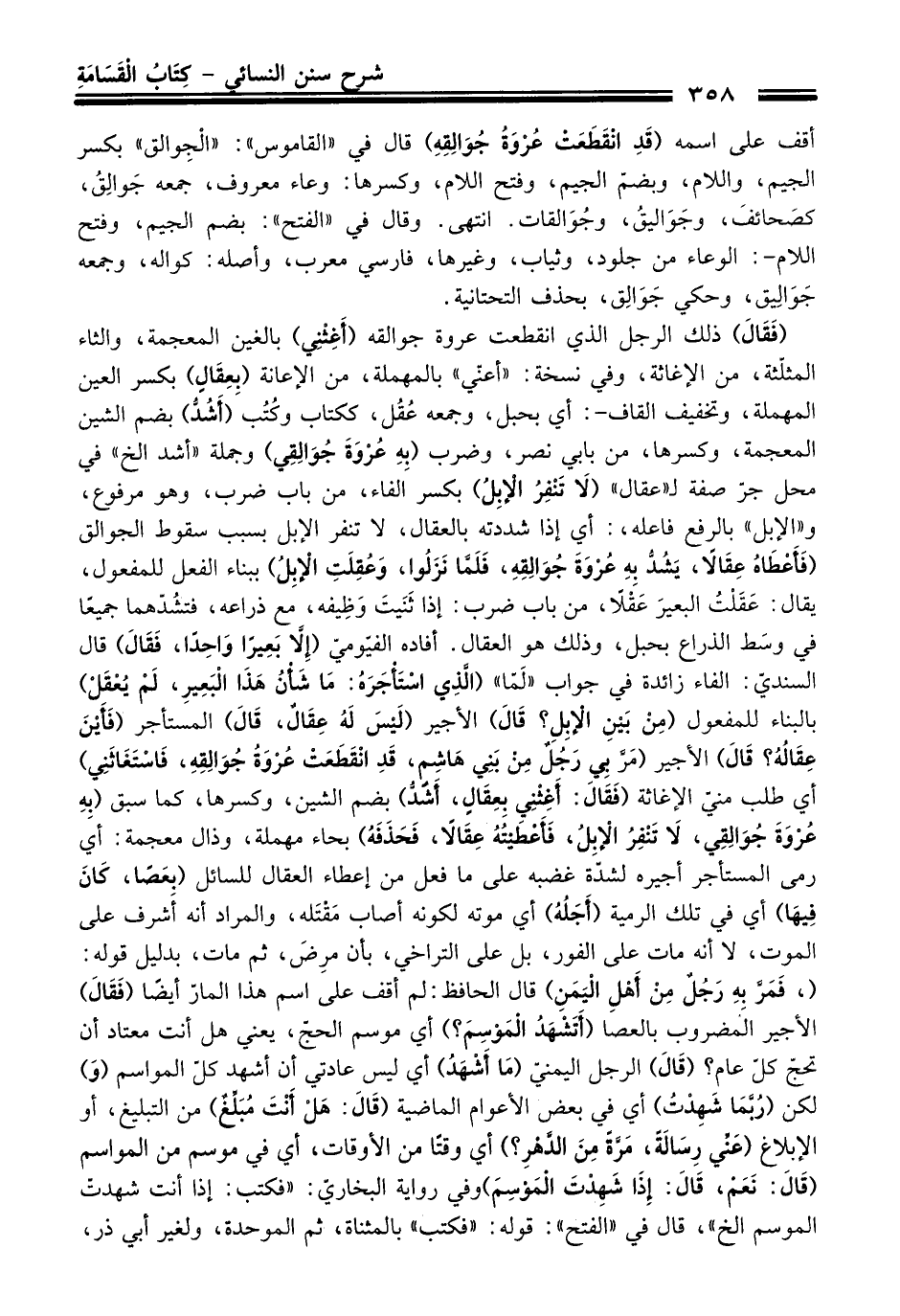 (فَقَالَ) ذلك الرجل الذي انقطعت عروة جوالقه (أَغِثْنِي) بالغين المعجمة، والثاء المثلّثة، منْ الإغاثة، وفي نسخة: "أعنّي" بالمهملة، منْ الإعانة (بِعِقَالٍ) بكسر العين المهملة، وتخفيف القاف-: أي بحبل، وجمعه عُقُل، ككتاب وكُتُبَ (أَشُدُّ) بضم الشين المعجمة، وكسرها، منْ بابي نصر، وضرب (بِهِ عُرْوَةَ جُوَالِقِي) وجملة "أشد الخ" فِي محل جرّ صفة لـ"عقال" (لَا تَنْفِرُ الإْبِلُ) بكسر الفاء، منْ باب ضرب، وهو مرفوع، و"الإبل" بالرفع فاعله،: أي إذا شددته بالعقال، لا تنفر الإبل بسبب سقوط الجوالق (فَأَعْطَاهُ عِقَالاً، يَشُدُّ بِهِ عُرْوَةَ جُوَالِقِهِ، فَلَمَّا نَزَلُوا، وَعُقِلَتِ الْإبِلُ) ببناء الفعل للمفعول، يقال: عَقَلْتُ البعيرَ عَقْلاً، منْ باب ضرب: إذا ثَنَيتَ وَظِيفه، مع ذراعه، فتشُدّهما جميعًا فِي وسَط الذراع بحبل، وذلك هو العقال. أفاده الفيّوميّ (إِلَّا بَعِيرًا وَاحِدًا، فَقَالَ) قَالَ السنديّ: الفاء زائدة فِي جواب "لَمّا" (الَّذِي اسْتَأْجَرَهُ: مَا شَأْنُ هَذَا الْبَعِيرِ، لَمْ يُعْقَلْ) بالبناء للمفعول (مِنْ بَيْنِ الإْبِلِ؟ قَالَ) الأجير (لَيْسَ لَهُ عِقَالٌ، قَالَ) المستأجر (فَأَيْنَ عِقَالُهُ؟ قَالَ) الأجير (مَرَّ بِي رَجُلٌ مِنْ بَنِي هَاشِمِ، قَدِ انْقَطَعَتْ عُرْوَةُ جُوَالِقِهِ، فَاسْتَغَاثَنِي) أي طلب منيّ الإغاثة (فَقَالَ: أَغِثْنِي بِعِقَالٍ، أَشُدُّ) بضم الشين، وكسرها، كما سبق (بِهِ عُرْوَةَ جُوَالِقِي، لَا تَنْفِرُ الْإبِلُ، فَأَعْطَيْتُهُ عِقَالاً، فَحَذَفَهُ) بحاء مهملة، وذال معجمة: أي رمى المستأجر أجيره لشدّة غضبه عَلَى ما فعل منْ إعطاء العقال للسائل (بِعَصًا، كَانَ فِيهَا) أي فِي تلك الرمية (أَجَلُهُ) أي موته لكونه أصاب مَقْتَله، والمراد أنه أشرف عَلَى الموت، لا أنه مات عَلَى الفور، بل عَلَى التراخي، بأن مرِضَ، ثم مات، بدليل قوله: (فَمَرَّ بِهِ رَجُلٌ مِنْ أَهْلِ الْيَمَنِ) قَالَ الحافظ: لم أقف عَلَى اسم هَذَا المارّ أيضًا (فَقَالَ) الأجير المضروب بالعصا (أَتَشْهَدُ الْمَوْسِمَ؟) أي موسم الحجّ، يعني هل أنت معتاد أن تحجّ كلّ عام؟ (قَالَ) الرجل اليمنيّ (مَا أَشْهَدُ) أي ليس عادتي أن أشهد كلّ المواسم (وَ) لكن (رُبَّمَا شَهِدْتُ) أي فِي بعض الأعوام الماضية (قَالَ: هَلْ أَنْتَ مُبَلِّغٌ) منْ التبليغ، أو الإبلاغ (عَنِّي رِسَالَةً، مَرَّةً مِنَ الدَّهْرِ؟) أي وقتًا منْ الأوقات، أي فِي موسم منْ المواسم (قَالَ: نَعَمْ، قَالَ: إِذَا شَهِدْتَ الْمَوْسِمَ) وفي رواية البخاريّ: "فكتب: إذا أنت شهدتّ الموسم الخ"، قَالَ فِي "الفتح": قوله: "فكتب" بالمثناة، ثم الموحدة، ولغير أبي ذر،
