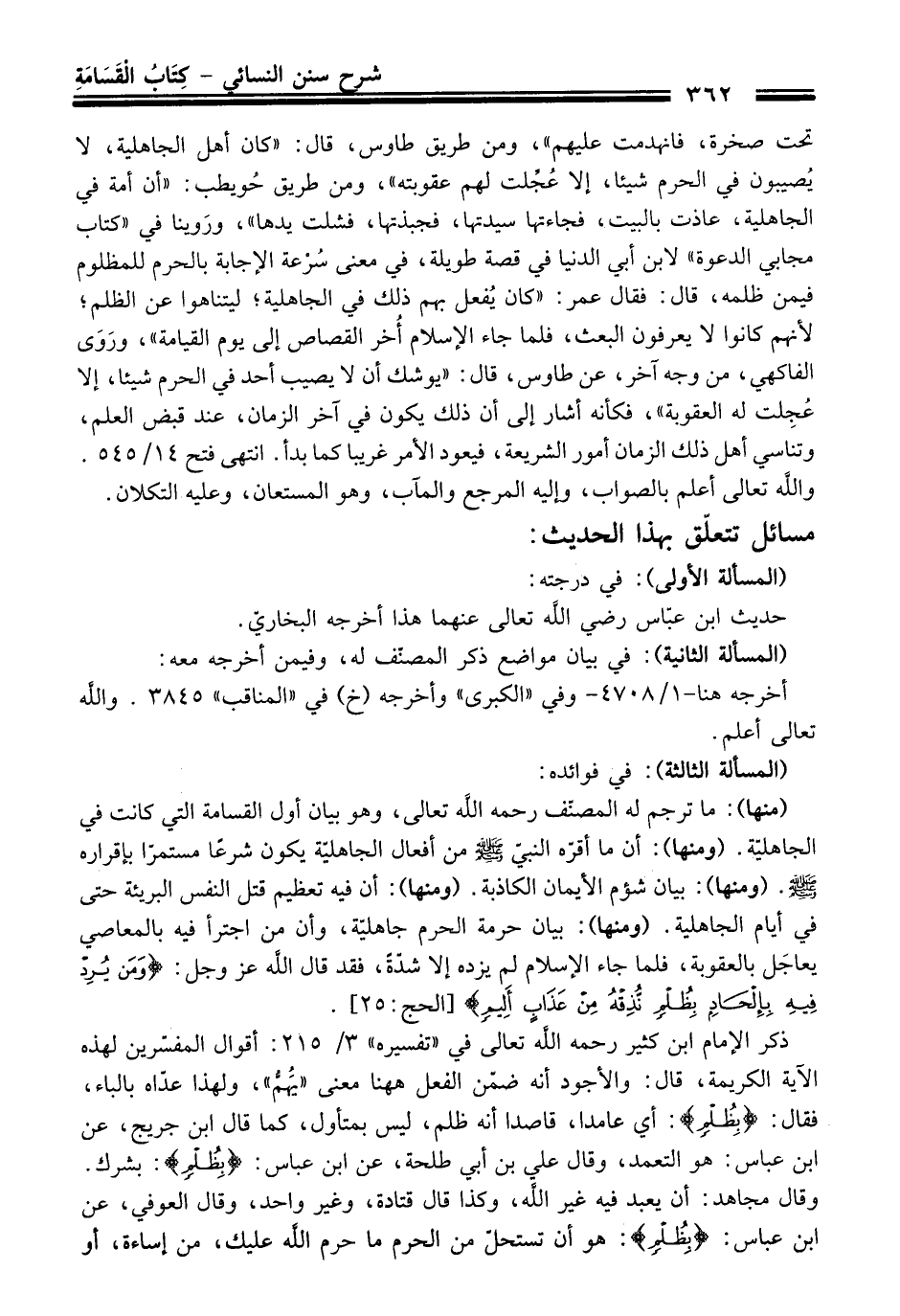 تحت صخرة، فانهدمت عليهم"، ومن طريق طاوس، قَالَ: "كَانَ أهل الجاهلية، لا يُصيبون فِي الحرم شيئا، إلا عُجِّلت لهم عقوبته"، ومن طريق حُويطب: "أن أمة فِي الجاهلية، عاذت بالبيت، فجاءتها سيدتها، فجبذتها، فشلت يدها"، ورَوينا فِي "كتاب مجابي الدعوة" لابن أبي الدنيا فِي قصة طويلة، فِي معنى سُرْعة الإجابة بالحرم للمظلوم فيمن ظلمه، قَالَ: فَقَالَ عمر: "كَانَ يُفعل بهم ذلك فِي الجاهلية؛ ليتناهوا عن الظلم؛ لأنهم كانوا لا يعرفون البعث، فلما جاء الإِسلام أُخر القصاص إلى يوم القيامة"، ورَوَى الفاكهي، منْ وجه آخر، عن طاوس، قَالَ: "يوشك أن لا يصيب أحد فِي الحرم شيئاً، إلا عُجِلت له العقوبة"، فكأنه أشار إلى أن ذلك يكون فِي آخر الزمان، عند قبض العلم، وتناسي أهل ذلك الزمان أمور الشريعة، فيعود الأمر غريبا كما بدأ. انتهى فتح 14/ 545. والله تعالى أعلم بالصواب، وإليه المرجع والمآب، وهو المستعان، وعليه التكلان.