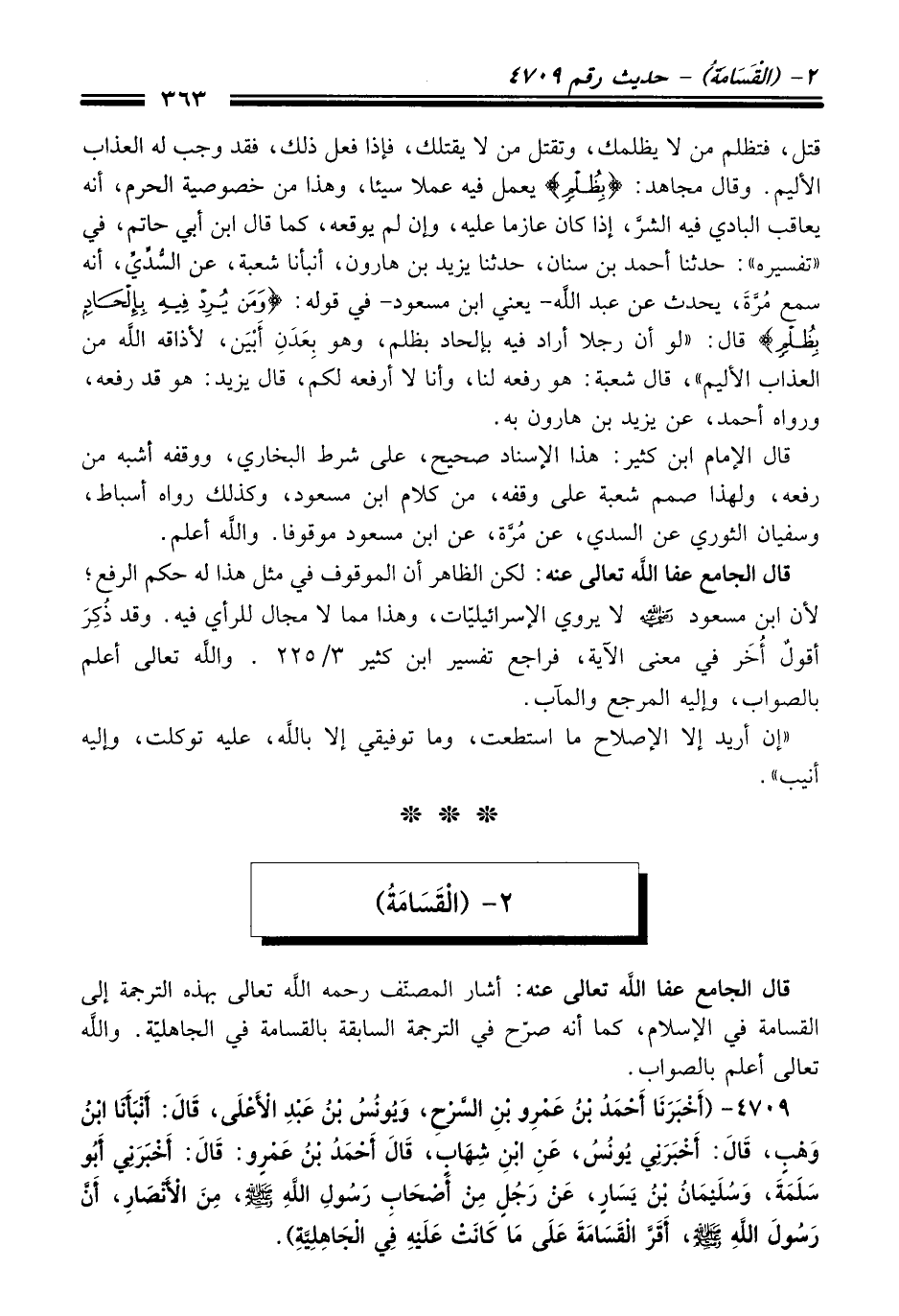 قَالَ الجامع عفا الله تعالى عنه: لكن الظاهر أن الموقوف فِي مثل هَذَا له حكم الرفع؛ لأن ابن مسعود -رضي الله عنه- لا يروي الإسرائيليّات، وهذا مما لا مجال للرأي فيه. وَقَدْ ذُكِرَ أقولٌ أُخَر فِي معنى الآية، فراجع تفسير ابن كثير 3/ 225. والله تعالى أعلم بالصواب، وإليه المرجع والمآب.