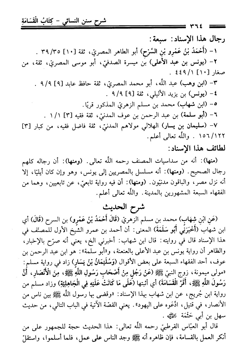 (عَنِ ابْنِ شِهَابٍ) محمد بن مسلم الزهريّ (قَالَ أَحْمَدُ بْنُ عَمْرو) بن السرح (قَالَ) أي ابن شهاب (أَخْبَرَنِي أَبُو سَلَمَةَ) المعنى: أن أحمد بن عمرو الشيخ الأول للمصنّف فِي هَذَا الإسناد قَالَ فِي روايته: قَالَ ابن شهاب: أخبرني الخ، يعني أنه صرّح بالإخبار، والظاهر أن رواية يونس بن عبد الأعلى بالعنعنة، و"أبو سلمة": هو ابن عبد الرحمن بن عوف، أحد الفقهاء السبعة عَلَى بعض الأقوال (وَسُلَيْمَانُ بْنُ يَسَارٍ) زاد فِي رواية مسلم: "مولى ميمونة، زوج النبيّ -صلى الله عليه وسلم- (عَنْ رَجُلٍ مِنْ أَصْحَابِ رَسُولِ اللَّهِ -صلى الله عليه وسلم-، مِنَ الْأَنْصَارِ، أَنَّ رَسُولَ اللَّهِ -صلى الله عليه وسلم-، أَقَرَّ الْقَسَامَةَ) أي أثبتها (عَلَى مَا كَانَتْ عَلَيْهِ فِي الْجَاهِلِيَّةِ) وزاد مسلم منْ رواية ابن جُريج، عن ابن شهاب بهذا الإسناد: "وقضى بها رسول الله -صلى الله عليه وسلم- بين ناس منْ الأنصار، فِي قتيل، ادَّعَوه عَلَى اليهود". يعني القصّة الآتية فِي الباب التالي، منْ حديث سهل بن أبي حَثْمَة -رضي الله عنه-.
