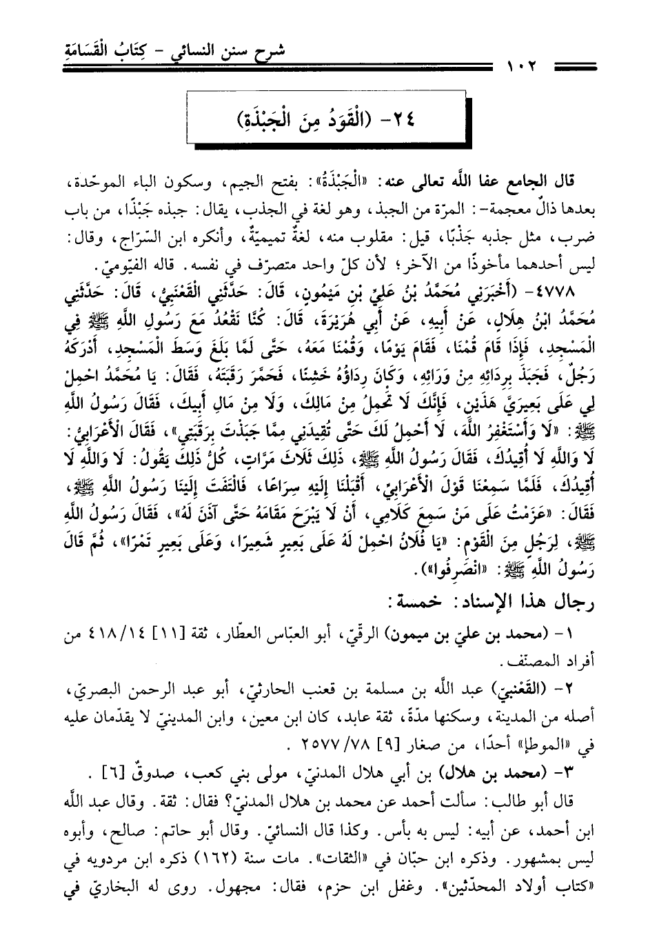 4778 - (أَخْبَرَنِي مُحَمَّدُ بْنُ عَلِيِّ بْنِ مَيْمُونٍ، قَالَ: حَدَّثَنِي الْقَعْنَبِيُّ، قَالَ: حَدَّثَنِي مُحَمَّدُ بْنُ هِلاَلٍ، عَنْ أَبِيهِ، عَنْ أَبِي هُرَيْرَةَ، قَالَ: كُنَّا نَقْعُدُ مَعَ رَسُولِ اللَّهِ -صلى الله عليه وسلم- فِي الْمَسْجِدِ، فَإِذَا قَامَ قُمْنَا، فَقَامَ يَوْمًا، وَقُمْنَا مَعَهُ، حَتَّى لَمَّا بَلَغَ وَسَطَ الْمَسْجِدِ، أَدْرَكَهُ رَجُلٌ، فَجَبَذَ بِرِدَائِهِ مِنْ وَرَائِهِ، وَكَانَ رِدَاؤُهُ خَشِنًا، فَحَمَّرَ رَقَبَتَهُ، فَقَالَ: يَا مُحَمَّدُ احْمِلْ لِي عَلَى بَعِيرَيَّ هَذَيْنِ، فَإِنَّكَ لاَ تَحْمِلُ مِنْ مَالِكَ، وَلاَ مِنْ مَالِ أَبِيكَ، فَقَالَ رَسُولُ اللَّهِ -صلى الله عليه وسلم-: "لاَ وَأَسْتَغْفِرُ اللَّهَ، لاَ أَحْمِلُ لَكَ حَتَّى تُقِيدَنِي مِمَّا جَبَذْتَ بِرَقَبَتِي"، فَقَالَ الأَعْرَابِيُّ: لاَ وَاللَّهِ لاَ أُقِيدُكَ، فَقَالَ رَسُولُ اللَّهِ -صلى الله عليه وسلم-، ذَلِكَ ثَلاَثَ مَرَّاتٍ، كُلُّ ذَلِكَ يَقُولُ: لاَ وَاللَّهِ لاَ أُقِيدُكَ. فَلَمَّا سَمِعْنَا قَوْلَ الأَعْرَابِيِّ، أَقْبَلْنَا إِلَيْهِ سِرَاعًا، فَالْتَفَتَ إِلَيْنَا رَسُولُ اللَّهِ -صلى الله عليه وسلم-، فَقَالَ: "عَزَمْتُ عَلَى مَنْ سَمِعَ كَلاَمِي، أَنْ لاَ يَبْرَحَ مَقَامَهُ حَتَّى آذَنَ لَهُ"، فَقَالَ رَسُولُ اللَّهِ -صلى الله عليه وسلم-، لِرَجُلٍ مِنَ الْقَوْمِ: "يَا فُلاَنُ احْمِلْ لَهُ عَلَى بَعِيرٍ شَعِيرًا، وَعَلَى بَعِيرٍ تَمْرًا"، ثُمَّ قَالَ رَسُولُ اللَّهِ -صلى الله عليه وسلم-: "انْصَرِفُوا").