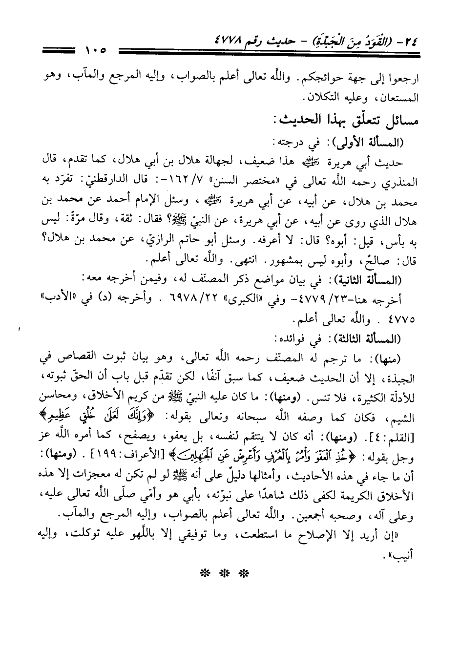 حديث أبي هريرة -رضي الله عنه- هَذَا ضعيف، لجهالة هلال بن أبي هلال، كما تقدم، قَالَ المنذري رحمه الله تعالى فِي "مختصر السنن" 7/ 162 - : قَالَ الدارقطنيّ: تفرّد به محمد بن هلال، عن أبيه، عن أبي هريرة -رضي الله عنه-، وسئل الإِمام أحمد عن محمد بن هلال الذي روى عن أبيه، عن أبي هريرة، عن النبيّ -صلى الله عليه وسلم-؟ فَقَالَ: ثقة، وَقَالَ مرّةً: ليس به بأس، قيل: أبوه؟ قَالَ: لا أعرفه. وسئل أبو حاتم الرازيّ، عن محمد بن هلال؟ قَالَ: صالحٌ، وأبوه ليس بمشهور. انتهى. والله تعالى أعلم.