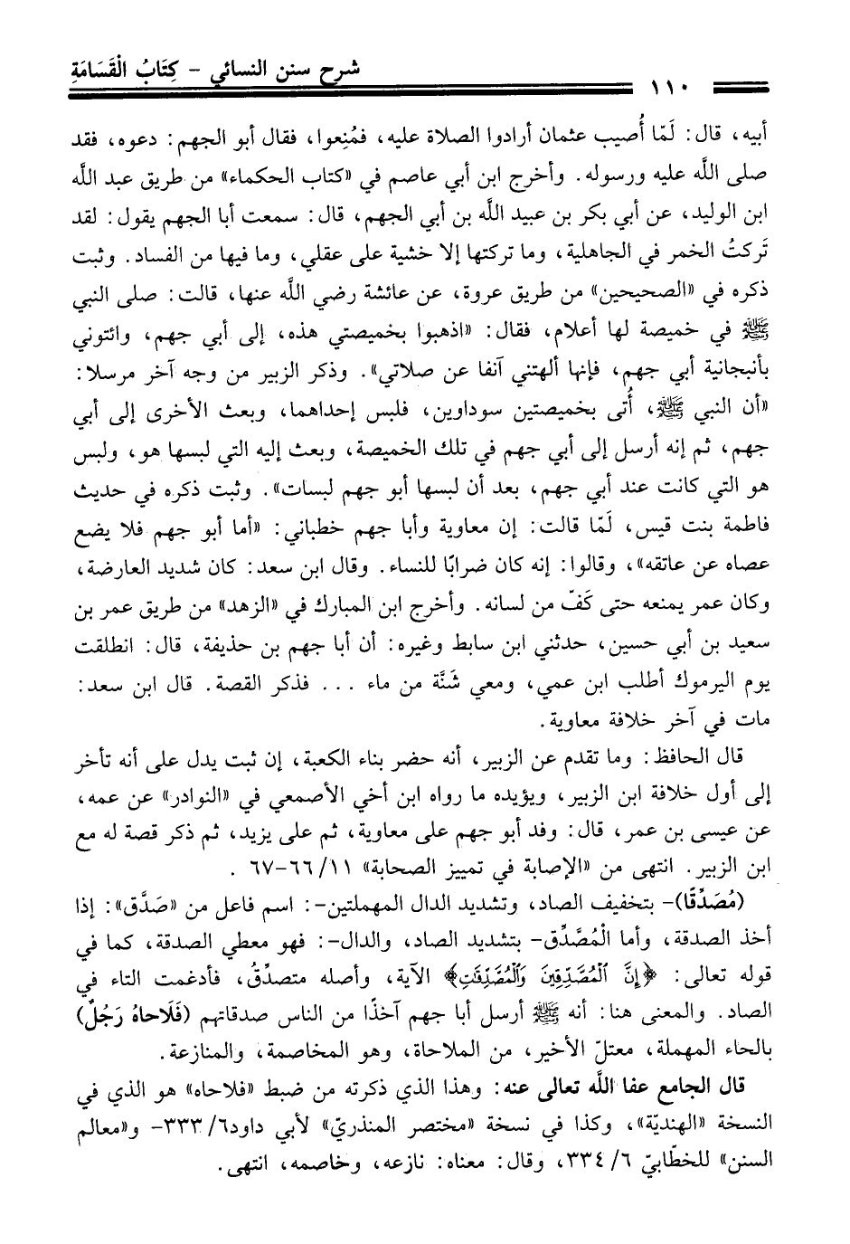 (مُصَدِّقًا) -بتخفيف الصاد، وتشديد الدال المهملتين-: اسم فاعل منْ "صَدَّق": إذا أخذ الصدقة، وأما الْمُصَّدِّق -بتشديد الصاد، والدال-: فهو معطي الصدقة، كما فِي قوله تعالى: {إِنَّ الْمُصَّدِّقِينَ وَالْمُصَّدِّقَاتِ} الآية، وأصله متصدِّقُ، فأدغمت التاء فِي الصاد. والمعنى هنا: أنه -صلى الله عليه وسلم- أرسل أبا جهم آخذًا منْ النَّاس صدقاتهم (فَلَاحاهُ رَجُلٌ) بالحاء المهملة، معتلّ الأخير، منْ الملاحاة، وهو المخاصمة، والمنازعة.