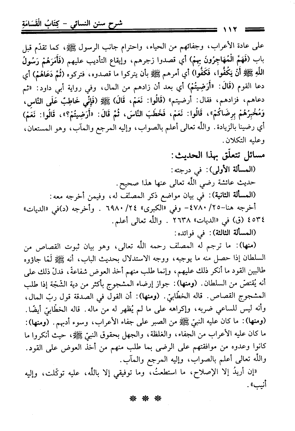 (منها): ما ترجم له المصنّف رحمه الله تعالى، وهو بيان ثبوت القصاص منْ السلطان إذا حصل منه ما يوجبه، ووجه الاستدلال بحديث الباب، أنه -صلى الله عليه وسلم- لَمّا جاؤوه طالبين القود ما أنكر ذلك عليهم، وإنما طلب منهم أخذ العوض شفاعةً، فدلّ ذلك عَلَى أنه يُقتصّ منْ السلطان. (ومنها): جواز إرضاء المشجوج بأكثر منْ دية الشّجّة إذا طلب المشجوج القصاص. قاله الخطّابيّ. (ومنها): أن القول فِي الصدقة قول ربّ المال، وأنه ليس للساعي ضربه، وإكراهه عَلَى ما لم يُظهر له منْ ماله. قاله الخطّابيّ أيضًا. (ومنها): ما كَانَ عليه النبيّ -صلى الله عليه وسلم- منْ الصبر عَلَى جفاء الأعراب، وسوء أدبهم. (ومنها): ما كَانَ عليه الأعراب منْ الجفاء، والغلظة، والجهل بحقوق النبيّ -صلى الله عليه وسلم-، حيث أنكروا ما كانوا وعدوه منْ موافقتهم عَلَى الرضى بما طلب منهم منْ أخذ العوض عَلَى القود. والله تعالى أعلم بالصواب، وإليه المرجع والمآب.