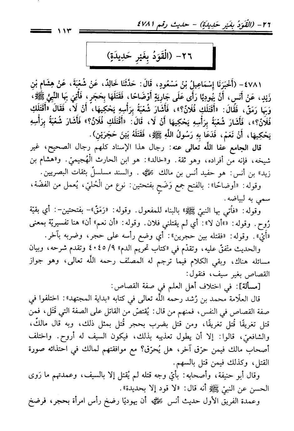 4781 - (أَخْبَرَنَا إِسْمَاعِيلُ بْنُ مَسْعُودٍ، قَالَ: حَدَّثَنَا خَالِدٌ، عَنْ شُعْبَةَ، عَنْ هِشَامِ بْنِ زَيْدٍ، عَنْ أَنَسٍ، أَنَّ يَهُودِيًّا رَأَى عَلَى جَارِيَةٍ أَوْضَاحًا، فَقَتَلَهَا بِحَجَرٍ، فَأُتِيَ بِهَا النَّبِيُّ -صلى الله عليه وسلم-، وَبِهَا رَمَقٌ، فَقَالَ: "أَقَتَلَكِ فُلاَنٌ؟ "، فَأَشَارَ شُعْبَةُ بِرَأْسِهِ يَحْكِيهَا، أَنْ لاَ، فَقَالَ: "أَقَتَلَكِ فُلاَنٌ؟ "، فَأَشَارَ شُعْبَةُ بِرَأْسِهِ يَحْكِيهَا أَنْ لاَ، قَالَ: "أَقَتَلَكِ فُلاَنٌ؟ "، فَأَشَارَ شُعْبَةُ بِرَأْسِهِ يَحْكِيهَا، أَنْ نَعَمْ، فَدَعَا بِهِ رَسُولُ اللَّهِ -صلى الله عليه وسلم-، فَقَتَلَهُ بَيْنَ حَجَرَيْنِ).