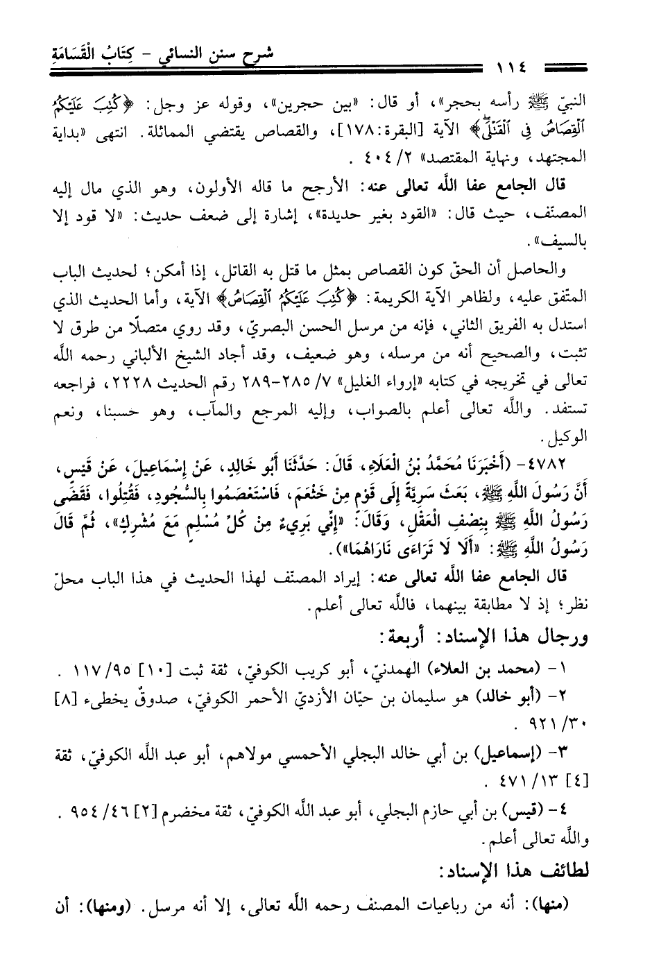 4782 - (أَخْبَرَنَا مُحَمَّدُ بْنُ الْعَلاَءِ، قَالَ: حَدَّثَنَا أَبُو خَالِدٍ، عَنْ إِسْمَاعِيلَ، عَنْ قَيْسٍ، أَنَّ رَسُولَ اللَّهِ -صلى الله عليه وسلم-، بَعَثَ سَرِيَّةً إِلَى قَوْمٍ مِنْ خَثْعَمٍ، فَاسْتَعْصَمُوا بِالسُّجُودِ، فَقُتِلُوا، فَقَضَى رَسُولُ اللَّهِ -صلى الله عليه وسلم- بِنِصْفِ الْعَقْلِ، وَقَالَ: "إِنِّي بَرِىءٌ مِنْ كُلِّ مُسْلِمٍ مَعَ مُشْرِكٍ"، ثُمَّ قَالَ رَسُولُ اللَّهِ -صلى الله عليه وسلم-، "أَلاَ لاَ تَرَاءَى نَارَاهُمَا").