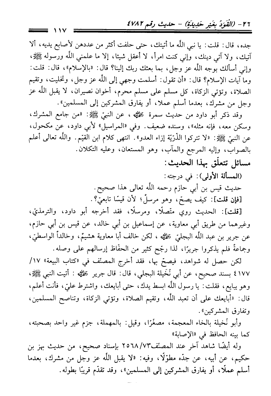 [قلت]: الْحَدِيث روي متّصلاً، ومرسلاً، فقد أخرجه أبو داود، والترمذيّ، وغيرهما منْ طريق أبي معاوية، عن إسماعيل بن أبي خالد، عن قيس بن أبي حازم، عن جرير بن عبد الله البجليّ -رضي الله عنه-، لكن خالف أبا معاوية هشيمٌ، وخالدًا الواسطيّ، وجماعةٌ فلم يذكروا جريرًا، لذا رجّح كثير منْ الحفّاظ إرسالهم عَلَى وصله.