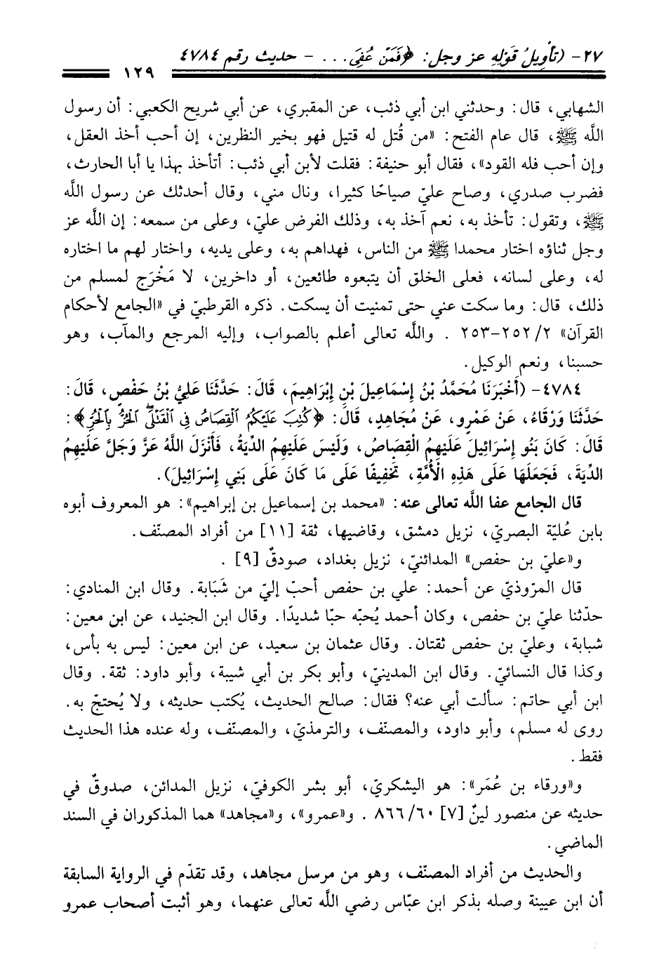 4784 - (أَخْبَرَنَا مُحَمَّدُ بْنُ إِسْمَاعِيلَ بْنِ إِبْرَاهِيمَ، قَالَ: حَدَّثَنَا عَلِيُّ بْنُ حَفْصٍ، قَالَ: حَدَّثَنَا وَرْقَاءُ، عَنْ عَمْرٍو، عَنْ مُجَاهِدٍ، قَالَ: {كُتِبَ عَلَيْكُمُ الْقِصَاصُ فِي الْقَتْلَى الْحُرُّ بِالْحُرِّ} قَالَ: كَانَ بَنُو إِسْرَائِيلَ عَلَيْهِمُ الْقِصَاصُ، وَلَيْسَ عَلَيْهِمُ الدِّيَةَ، فَأَنْزَلَ اللَّهُ عَزَّ وَجَلَّ عَلَيْهِمُ الدِّيَةَ، فَجَعَلَهَا عَلَى هَذِهِ الأُمَّةِ، تَخْفِيفًا عَلَى مَا كَانَ عَلَى بَنِي إِسْرَائِيلَ).