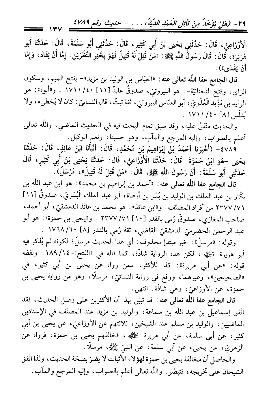 قَالَ الجامع عفا الله تعالى عنه: قد تبيّن بهذا أن الأكثرين عَلَى وصل الْحَدِيث، فقد اتّفق إسماعيل بن عبد الله بن سماعة، والوليد بن مزيد عند المصنّف فِي الإسنادين الماضيين، والوليد بن مسلم عند الشيخين، ثلاثتهم عن الأوزاعيّ، عن يحيى بن أبي كثير، عن أبي سلمة، عن أبي هريرة -رضي الله عنه-، فخالفهم يحيى بن حمزة، فرواه عن الزهريّ، عن يحيى، عن أبي سلمة، عن النبيّ -صلى الله عليه وسلم-، مرسلاً.