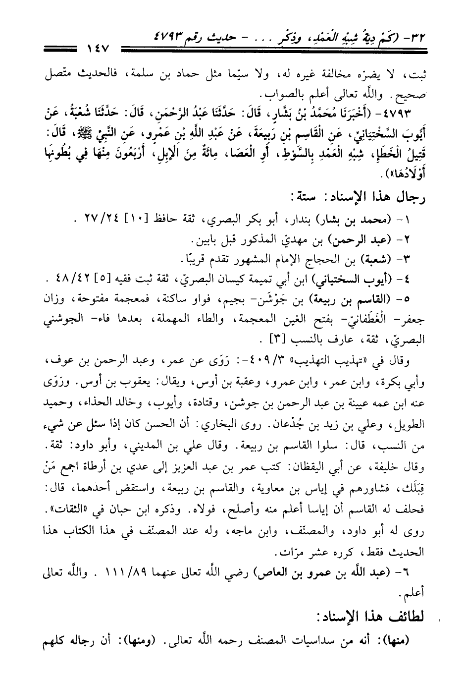 4793 - (أَخْبَرَنَا مُحَمَّدُ بْنُ بَشَّارٍ، قَالَ: حَدَّثَنَا عَبْدُ الرَّحْمَنِ، قَالَ: حَدَّثَنَا شُعْبَةُ، عَنْ أَيُّوبَ السَّخْتِيَانِيِّ، عَنِ الْقَاسِمِ بْنِ رَبِيعَةَ، عَنْ عَبْدِ اللَّهِ بْنِ عَمْرٍو، عَنِ النَّبِيِّ -صلى الله عليه وسلم-، قَالَ: "قَتِيلُ الْخَطَإِ، شِبْهِ الْعَمْدِ بِالسَّوْطِ، أَوِ الْعَصَا، مِائَةٌ مِنَ الإِبِلِ، أَرْبَعُونَ مِنْهَا فِي بُطُونِهَا أَوْلاَدُهَا").