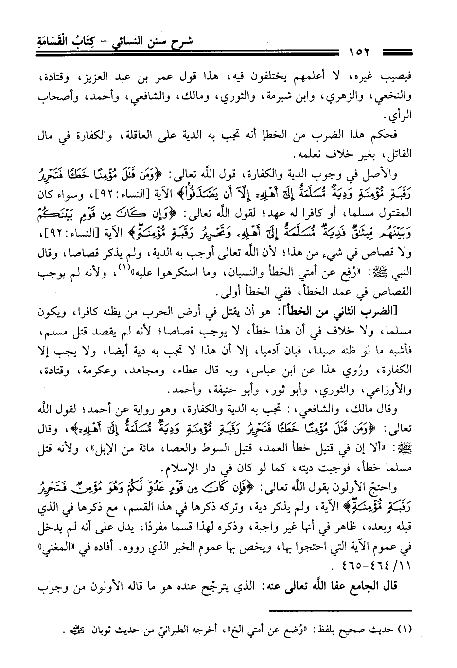 واحتجّ الأولون بقول والله تعالى: {فَإِنْ كَانَ مِنْ قَوْمٍ عَدُوٍّ لَكُمْ وَهُوَ مُؤْمِنٌ فَتَحْرِيرُ رَقَبَةٍ مُؤْمِنَةٍ} الآية، ولم يذكر دية، وتركه ذكرها فِي هَذَا القسم، مع ذكرها فِي الذي قبله وبعده، ظاهر فِي أنها غير واجبة، وذكره لهذا قسما مفردا، يدل عَلَى أنه لم يدخل فِي عموم الآية التي احتجوا بها، ويخص بها عموم الخبر الذي رووه. أفاده فِي "المغني" 11/ 464 - 465.