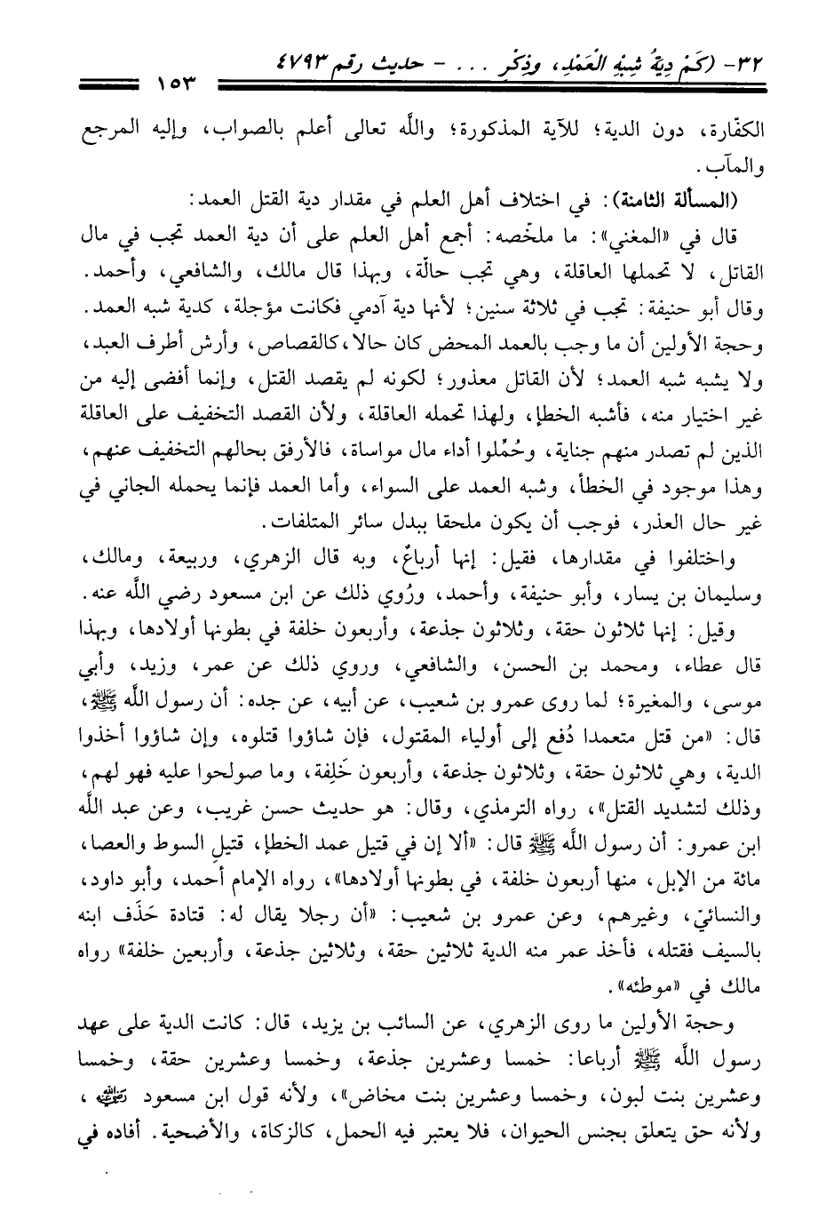 وقيل: إنها ثلاثون حقة، وثلاثون جذعة، وأربعون خلفة فِي بطونها أولادها، وبهذا قَالَ عطاء، ومحمد بن الحسن، والشافعي، وروي ذلك عن عمر، وزيد، وأبي موسى، والمغيرة؛ لما روى عمرو بن شعيب، عن أبيه، عن جده: أن رسول الله -صلى الله عليه وسلم-, قَالَ: "منْ قتل متعمدا دُفع إلى أولياء المقتول، فإن شاؤوا قتلوه، وإن شاؤوا أخذوا الدية، وهي ثلاثون حقة، وثلاثون جذعة، وأربعون خَلِفة، وما صولحوا عليه فهو لهم، وذلك لتشديد القتل"، رواه الترمذيّ، وَقَالَ: هو حديث حسن غريب، وعن عبد الله ابن عمرو: أن رسول الله -صلى الله عليه وسلم- قَالَ: "ألا إن فِي قتيل عمد الخطإ، قتيلِ السوط والعصا، مائة منْ الإبل، منها أربعون خلفة، فِي بطونها أولادها"، رواه الإمام أحمد، وأبو داود، والنسائيّ، وغيرهم، وعن عمرو بن شعيب: "أن رجلا يقال له: قتادة حَذَف ابنه بالسيف فقتله، فأخذ عمر منه الدية ثلاثين حقة، وثلاثين جذعة، وأربعين خلفة" رواه مالك فِي "موطئه".