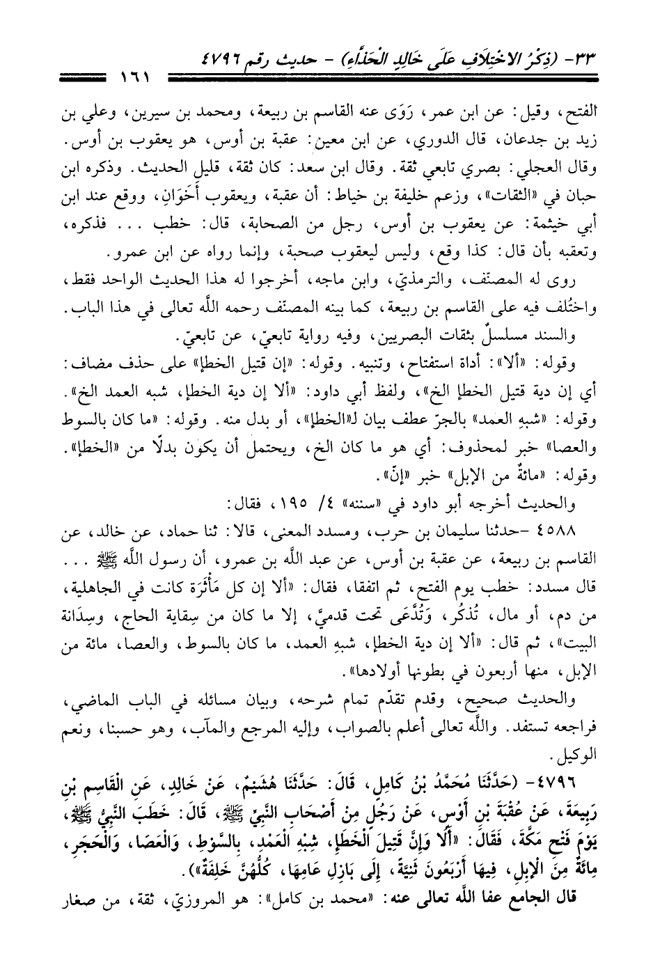 4796 - (حَدَّثَنَا مُحَمَّدُ بْنُ كَامِلٍ، قَالَ: حَدَّثَنَا هُشَيْمٌ، عَنْ خَالِدٍ، عَنِ الْقَاسِمِ بْنِ رَبِيعَةَ، عَنْ عُقْبَةَ بْنِ أَوْسٍ، عَنْ رَجُلٍ مِنْ أَصْحَابِ النَّبِيِّ -صلى الله عليه وسلم-، قَالَ: خَطَبَ النَّبِيُّ -صلى الله عليه وسلم- يَوْمَ فَتْحِ مَكَّةَ، فَقَالَ: "أَلاَ وَإِنَّ قَتِيلَ الْخَطَإِ، شِبْهِ الْعَمْدِ، بِالسَّوْطِ، وَالْعَصَا، وَالْحَجَرِ، مِائَةٌ مِنَ الإِبِلِ، فِيهَا أَرْبَعُونَ ثَنِيَّةً، إِلَى بَازِلِ عَامِهَا، كُلُّهُنَّ خَلِفَةٌ").