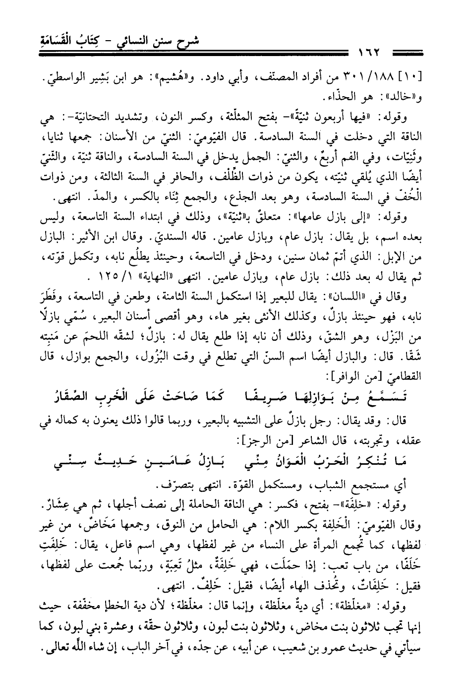 وقوله "فيها أربعون ثنيّةً" -بفتح المثلّثة، وكسر النون، وتشديد التحتانيّة-: هي الناقة التي دخلت فِي السنة السادسة. قَالَ الفيّوميّ: الثنيّ منْ الأسنان: جمعها ثنايا، وثَنِيات، وفي الفم أربعٌ، والثنيّ: الجمل يدخل فِي السنة السادسة، والناقة ثنيّة، والثّنيّ أيضًا الذي يُلقي ثنيّته، يكون منْ ذوات الظِّلْف، والحافر فِي السنة الثالثة، ومن ذوات الْخُفّ فِي السنة السادسة، وهو بعد الجذع، والجمع ثِنَاء بالكسر، والمدّ. انتهى.