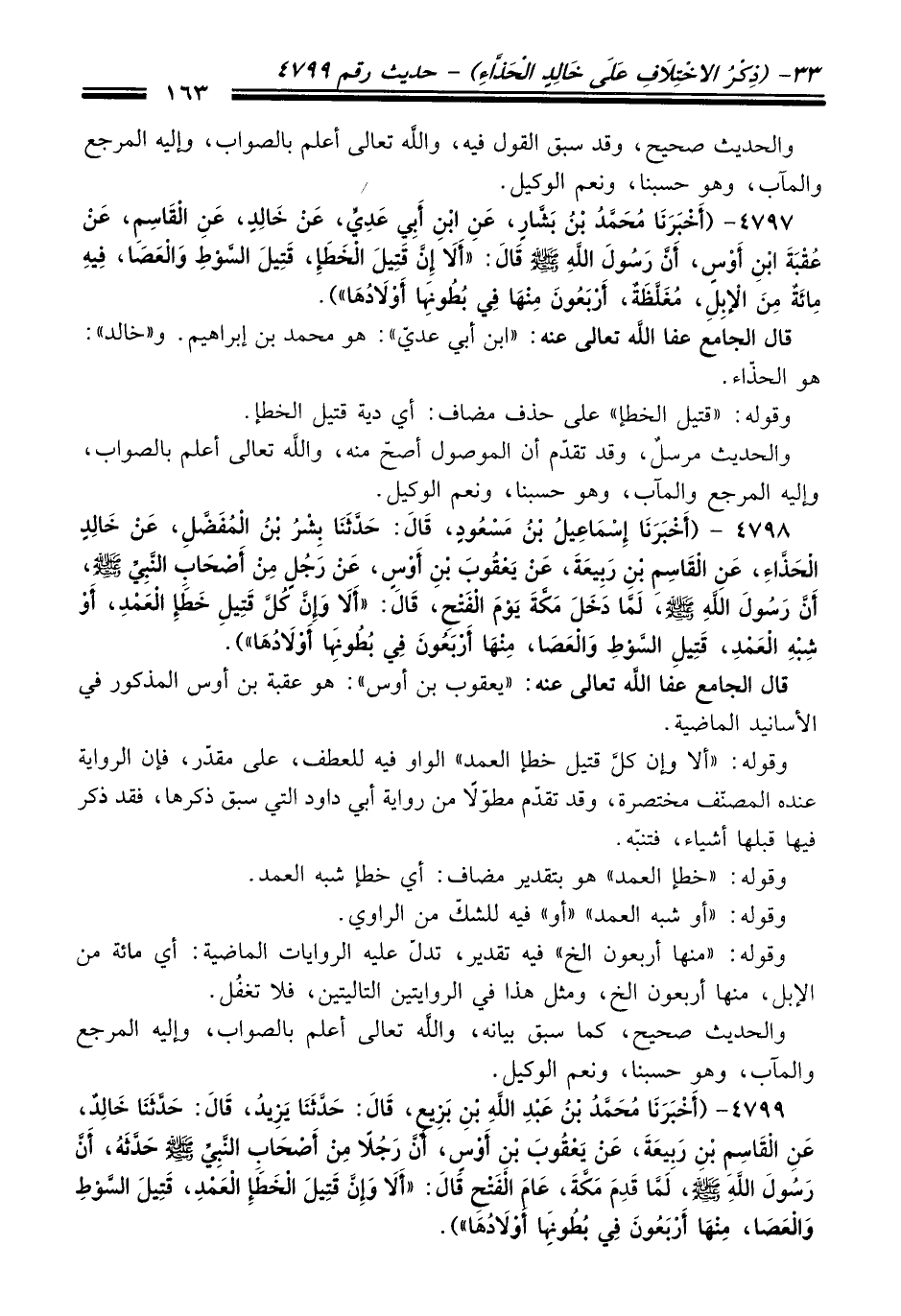 4797 - (أَخْبَرَنَا مُحَمَّدُ بْنُ بَشَّارٍ، عَنِ ابْنِ أَبِي عَدِيٍّ، عَنْ خَالِدٍ، عَنِ الْقَاسِمِ، عَنْ عُقْبَةَ بْنِ أَوْسٍ، أَنَّ رَسُولَ اللَّهِ -صلى الله عليه وسلم- قَالَ: "أَلاَ إِنَّ قَتِيلَ الْخَطَإِ، قَتِيلَ السَّوْطِ وَالْعَصَا، فِيهِ مِائَةٌ مِنَ الإِبِلِ، مُغَلَّظَةٌ، أَرْبَعُونَ مِنْهَا فِي بُطُونِهَا أَوْلاَدُهَا").