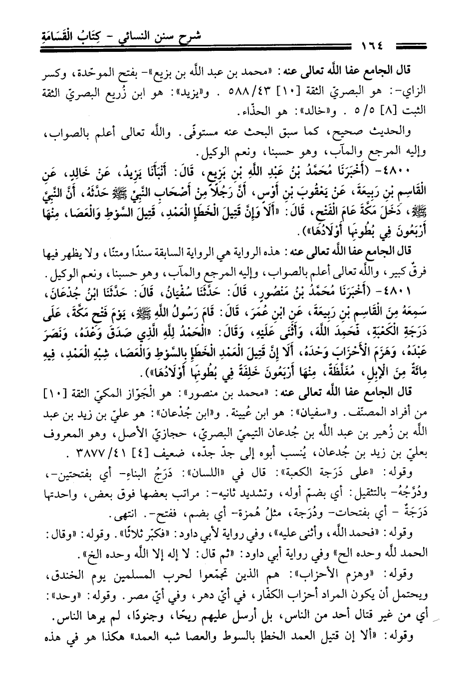 4801 - (أَخْبَرَنَا مُحَمَّدُ بْنُ مَنْصُورٍ، قَالَ: حَدَّثَنَا سُفْيَانُ، قَالَ: حَدَّثَنَا ابْنُ جُدْعَانَ، سَمِعَهُ مِنَ الْقَاسِمِ بْنِ رَبِيعَةَ، عَنِ ابْنِ عُمَرَ، قَالَ: قَامَ رَسُولُ اللَّهِ -صلى الله عليه وسلم-، يَوْمَ فَتْحِ مَكَّةَ، عَلَى دَرَجَةِ الْكَعْبَةِ، فَحَمِدَ اللَّهَ، وَأَثْنَى عَلَيْهِ، وَقَالَ: "الْحَمْدُ لِلَّهِ الَّذِي صَدَقَ وَعْدَهُ، وَنَصَرَ عَبْدَهُ، وَهَزَمَ الأَحْزَابَ وَحْدَهُ، أَلاَ إِنَّ قَتِيلَ الْعَمْدِ الْخَطَإِ بِالسَّوْطِ وَالْعَصَا، شِبْهِ الْعَمْدِ، فِيهِ مِائَةٌ مِنَ الإِبِلِ، مُغَلَّظَةٌ، مِنْهَا أَرْبَعُونَ خَلِفَةٌ فِي بُطُونِهَا أَوْلاَدُهَا").