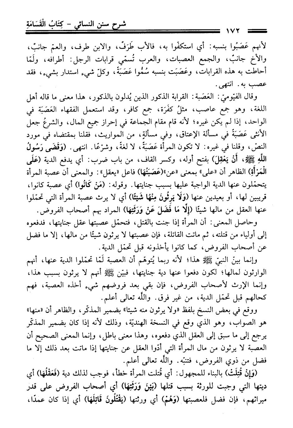 وَقَالَ الفيّوميّ: العَصَبة: القرابة الذكور الذين يُدلون بالذكور، هَذَا معنى ما قاله أهل اللغة، وهو جمع عاصب، مثلُ كفَرَة، جمع كافر، وَقَدْ استعمل الفقهاء العَصَبَة فِي الواحد، إذا لم يكن غيره؛ لأنه قام مقام الجماعة فِي إحراز جميع المال، والشرعُ جعل الأنثى عَصبَةً فِي مسألة الإعتاق، وفي مسألةٍ، منْ المواريث، فقلنا بمقتضاه فِي مورد النصّ، وقلنا فِي غيره: لا تكون المرأة عَصبَةً، لا لغةً، وشرْعًا. انتهى. (وَقَضَى رَسُولُ اللهِ -صلى الله عليه وسلم-، أَنْ يَعْقِلَ) بفتح أوله، وكسر القاف، منْ باب ضرب: أي يدفع الدية (عَلَى الْمَرْأَةِ) الظاهر أن "عَلَى" بمعنى "عن" (عَصَبَتُهَا) فاعل "يعقل": والمعنى أن عصبة المرأة يتحمّلون عنها الدية الواجبة عليها بسبب جنايتها. وقوله: (مَنْ كَانُوا) أي عصبة كانوا، قريبين لها، أو بعيدين عنها (وَلَا يَرِثُونَ مِنْهُا شَيْئًا) أي لا يرث عصبة المرأة التي تحمّلوا عنها العقل منْ مالها شيئًا (إِلَّا مَا فَضَلَ عَنْ وَرَثَتِهَا) المراد بهم أصحاب الفروض.