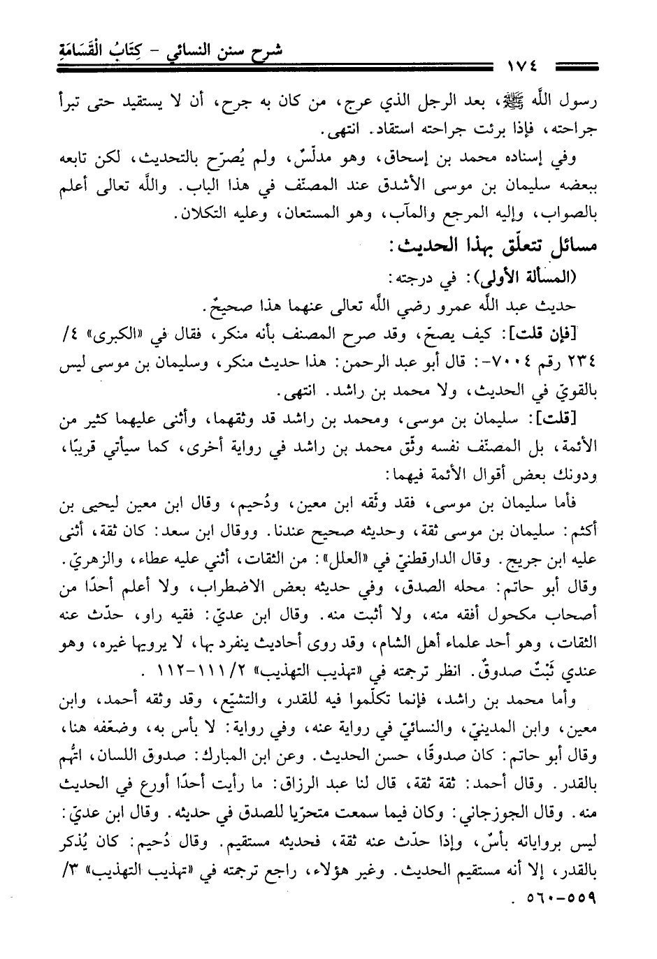 وفي إسناده محمد بن إسحاق، وهو مدلّسٌ، ولم يُصرّح بالتحديث، لكن تابعه ببعضه سليمان بن موسى الأشدق عند المصنّف فِي هَذَا الباب. والله تعالى أعلم بالصواب، وإليه المرجع والمآب، وهو المستعان، وعليه التكلان.
