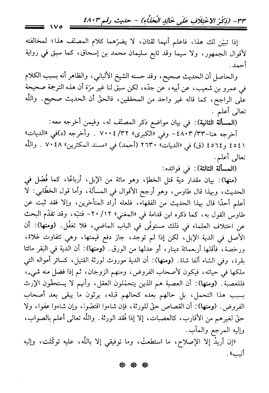 والحاصل أن الْحَدِيث صحيح، وَقَدْ حسنه الشيخ الألباني، والظاهر أنه بسبب الكلام فِي عمرو بن شعيب، عن أبيه، عن جدّه، لكن سبق لنا غير مرّة أن هذه الترجمة صحيحة عَلَى الراجح، كما قاله غير واحد منْ المحققين، فالحقّ أن الْحَدِيث صحيح. والله تعالى أعلم.