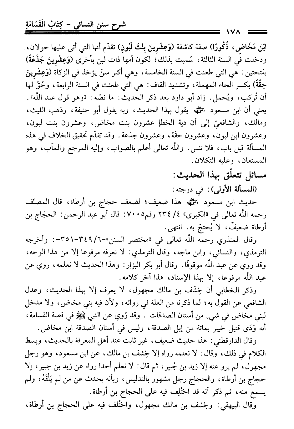 حديث ابن مسعود -رضي الله عنه- هَذَا ضعيف؛ لضعف حجاج بن أرطاة، قَالَ المصنّف رحمه الله تعالى فِي "الكبرى" 4/ 234 رقم 7005: قَالَ أبو عبد الرحمن: الحجّاج بن أرطاة ضعيفٌ، لا يُحتجّ به. انتهى.