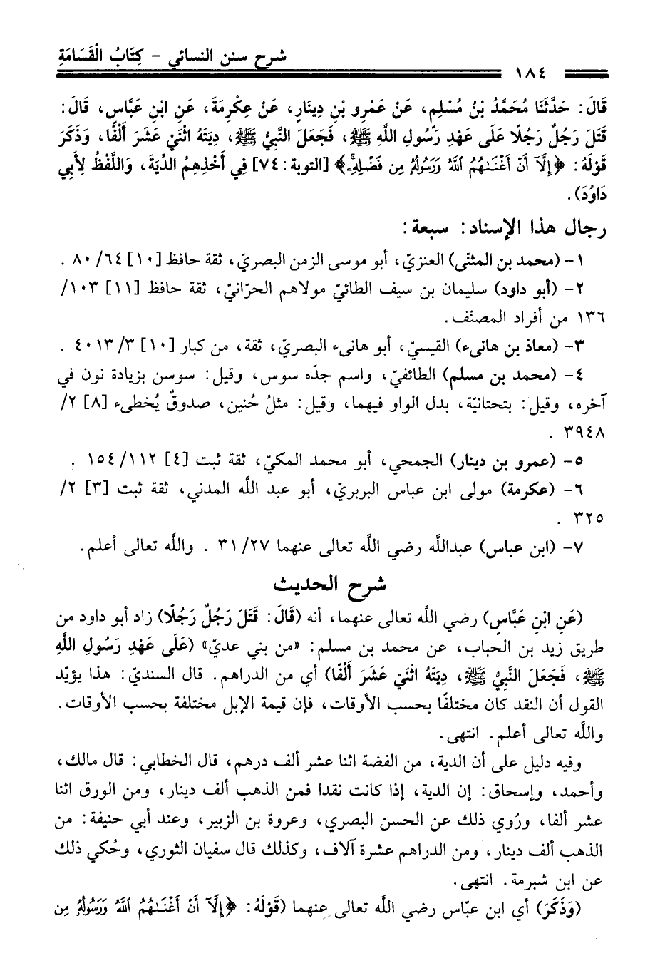 قَالَ: حَدَّثَنَا مُحَمَّدُ بْنُ مُسْلِمٍ، عَنْ عَمْرِو بْنِ دِينَارٍ، عَنْ عِكْرِمَةَ، عَنِ ابْنِ عَبَّاسٍ، قَالَ: قَتَلَ رَجُلٌ رَجُلاً عَلَى عَهْدِ رَسُولِ اللَّهِ -صلى الله عليه وسلم-، فَجَعَلَ النَّبِيُّ -صلى الله عليه وسلم-، دِيَتَهُ اثْنَىْ عَشَرَ أَلْفًا، وَذَكَرَ قَوْلَهُ: {إِلَّا أَنْ أَغْنَاهُمُ اللَّهُ وَرَسُولُهُ مِنْ فَضْلِهِ} [التوبة: 74] فِي أَخْذِهِمُ الدِّيَةَ. وَاللَّفْظُ لأَبِى دَاوُدَ).