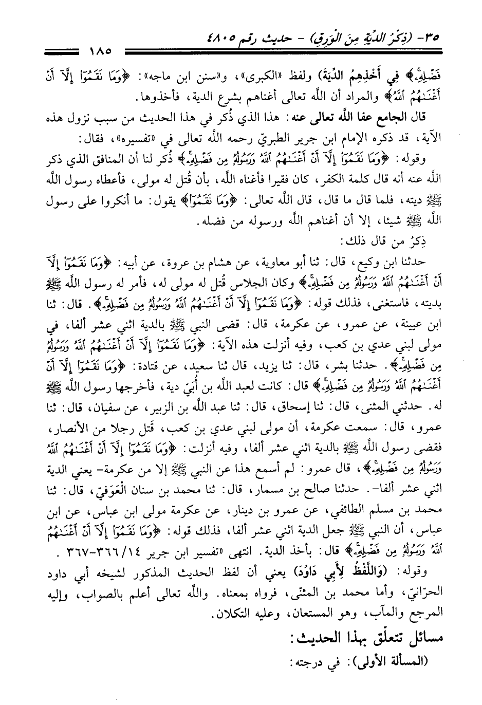 حدثنا ابن وكيع، قَالَ: ثنا أبو معاوية، عن هشام بن عروة، عن أبيه: {وَمَا نَقَمُوا إِلَّا أَنْ أَغْنَاهُمُ اللَّهُ وَرَسُولُهُ مِنْ فَضْلِهِ} وكان الجلاس قُتل له مولى له، فأمر له رسول الله -صلى الله عليه وسلم- بديته، فاستغنى، فذلك قوله: {وَمَا نَقَمُوا إِلَّا أَنْ أَغْنَاهُمُ اللَّهُ وَرَسُولُهُ مِنْ فَضْلِهِ}. قَالَ: ثنا ابن عيينة، عن عمرو، عن عكرمة، قَالَ: قضى النبيّ -صلى الله عليه وسلم- بالدية اثني عشر ألفا، فِي مولى لبني عدي بن كعب، وفيه أنزلت هذه الآية: {وَمَا نَقَمُوا إِلَّا أَنْ أَغْنَاهُمُ اللَّهُ وَرَسُولُهُ مِنْ فَضْلِهِ}. حدثنا بشر، قَالَ: ثنا يزيد، قَالَ ثنا سعيد، عن قتادة: {وَمَا نَقَمُوا إِلَّا أَنْ أَغْنَاهُمُ اللَّهُ وَرَسُولُهُ مِنْ فَضْلِهِ} قَالَ: كانت لعبد الله بن أُبَيّ دية، فأخرجها رسول الله -صلى الله عليه وسلم- له. حدثني المثنى، قَالَ: ثنا إسحاق، قَالَ: ثنا عبد الله بن الزبير، عن سفيان، قَالَ: ثنا عمرو، قَالَ: سمعت عكرمة، أن مولى لبني عدي بن كعب، قَتل رجلا منْ الأنصار، فقضى رسول الله -صلى الله عليه وسلم- بالدية اثني عشر ألفا، وفيه أنزلت: {وَمَا نَقَمُوا إِلَّا أَنْ أَغْنَاهُمُ اللَّهُ وَرَسُولُهُ مِنْ فَضْلِهِ} , قَالَ عمرو: لم أسمع هَذَا عن النبيّ -صلى الله عليه وسلم- إلا منْ عكرمة -يعني الدية اثني عشر ألفا-. حدثنا صالح بن مسمار، قَالَ: ثنا محمد بن سنان الْعَوَفيّ، قَالَ: ثنا محمد بن مسلم الطائفي، عن عمرو بن دينار، عن عكرمة مولى ابن عباس، عن ابن عباس، أن النبيّ -صلى الله عليه وسلم- جعل الدية اثني عشر ألفا، فذلك قوله: {وَمَا نَقَمُوا إِلَّا أَنْ أَغْنَاهُمُ اللَّهُ وَرَسُولُهُ مِنْ فَضْلِهِ} قَالَ: بأخذ الدية. انتهى "تفسير ابن جرير" 14/ 366 - 367.