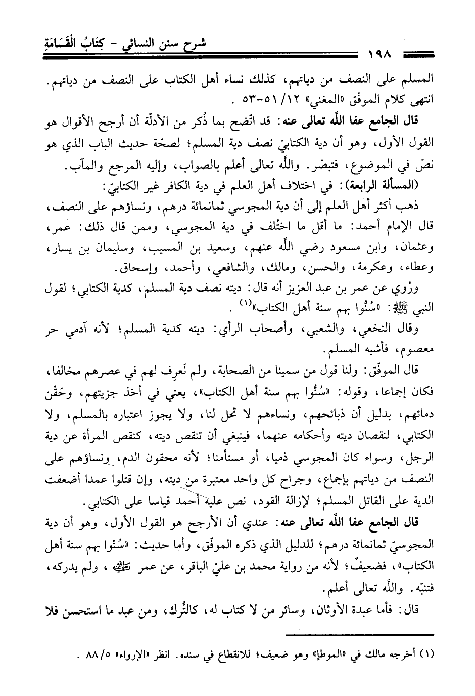 قَالَ الجامع عفا الله تعالى عنه: عندي أن الأرجح هو القول الأول، وهو أن دية المجوسيّ ثمانمائة درهم؛ للدليل الذي ذكره الموفّق، وأما حديث: "سُنّوا بهم سنة أهل الكتاب"، فضعيفٌ؛ لأنه منْ رواية محمد بن عليّ الباقر، عن عمر -رضي الله عنه-, ولم يدركه، فتنبّه. والله تعالى أعلم.