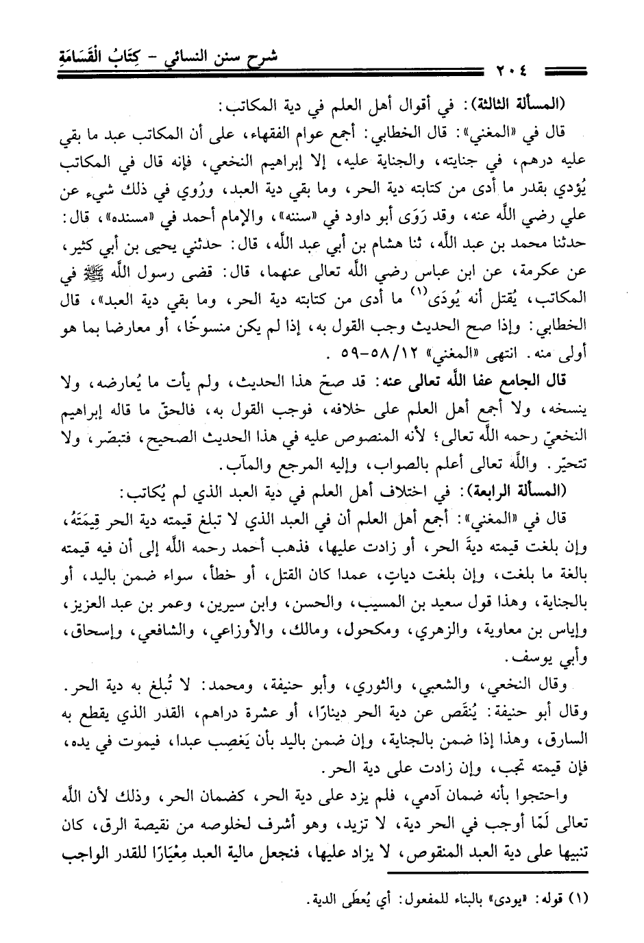 قَالَ فِي "المغني": قَالَ الخطّابيّ: أجمع عوام الفقهاء، عَلَى أن المكاتب عبد ما بقي عليه درهم، فِي جنايته، والجناية عليه، إلا إبراهيم النخعي، فإنه قَالَ فِي المكاتب يُؤدي بقدر ما أدى منْ كتابته دية الحر، وما بقي دية العبد، ورُوي فِي ذلك شيء عن علي رضي الله عنه، وَقَدْ رَوَى أبو داود فِي "سننه"، والإمام أحمد فِي "مسنده"، قَالَ: حدثنا محمد بن عبد الله، ثنا هشام بن أبي عبد الله، قَالَ: حدثني يحيى بن أبي كثير، عن عكرمة، عن ابن عباس رضي الله تعالى عنهما، قَالَ: قضى رسول الله -صلى الله عليه وسلم- فِي المكاتب، يُقتل أنه يُودَى (¬1) ما أدى منْ كتابته دية الحر، وما بقي دية العبد"، قَالَ الخطّابيّ: وإذا صح الْحَدِيث وجب القول به، إذا لم يكن منسوخًا، أو معارضا بما هو أولى منه. انتهى "المغني" 12/ 58 - 59.