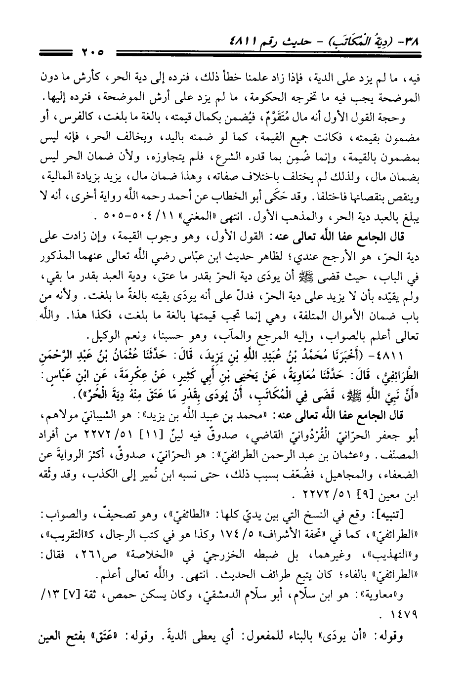 4811 - (أَخْبَرَنَا مُحَمَّدُ بْنُ عُبَيْدِ اللَّهِ بْنِ يَزِيدَ، قَالَ: حَدَّثَنَا عُثْمَانُ بْنُ عَبْدِ الرَّحْمَنِ الطَّرَائِفِيُّ، قَالَ: حَدَّثَنَا مُعَاوِيَةُ، عَنْ يَحْيَى بْنِ أَبِي كَثِيرٍ، عَنْ عِكْرِمَةَ، عَنِ ابْنِ عَبَّاسٍ: "أَنَّ نَبِيَّ اللَّهِ -صلى الله عليه وسلم-، قَضَى فِي الْمُكَاتَبِ، أَنْ يُودَى بِقَدْرِ مَا عَتَقَ مِنْهُ دِيَةَ الْحُرِّ").