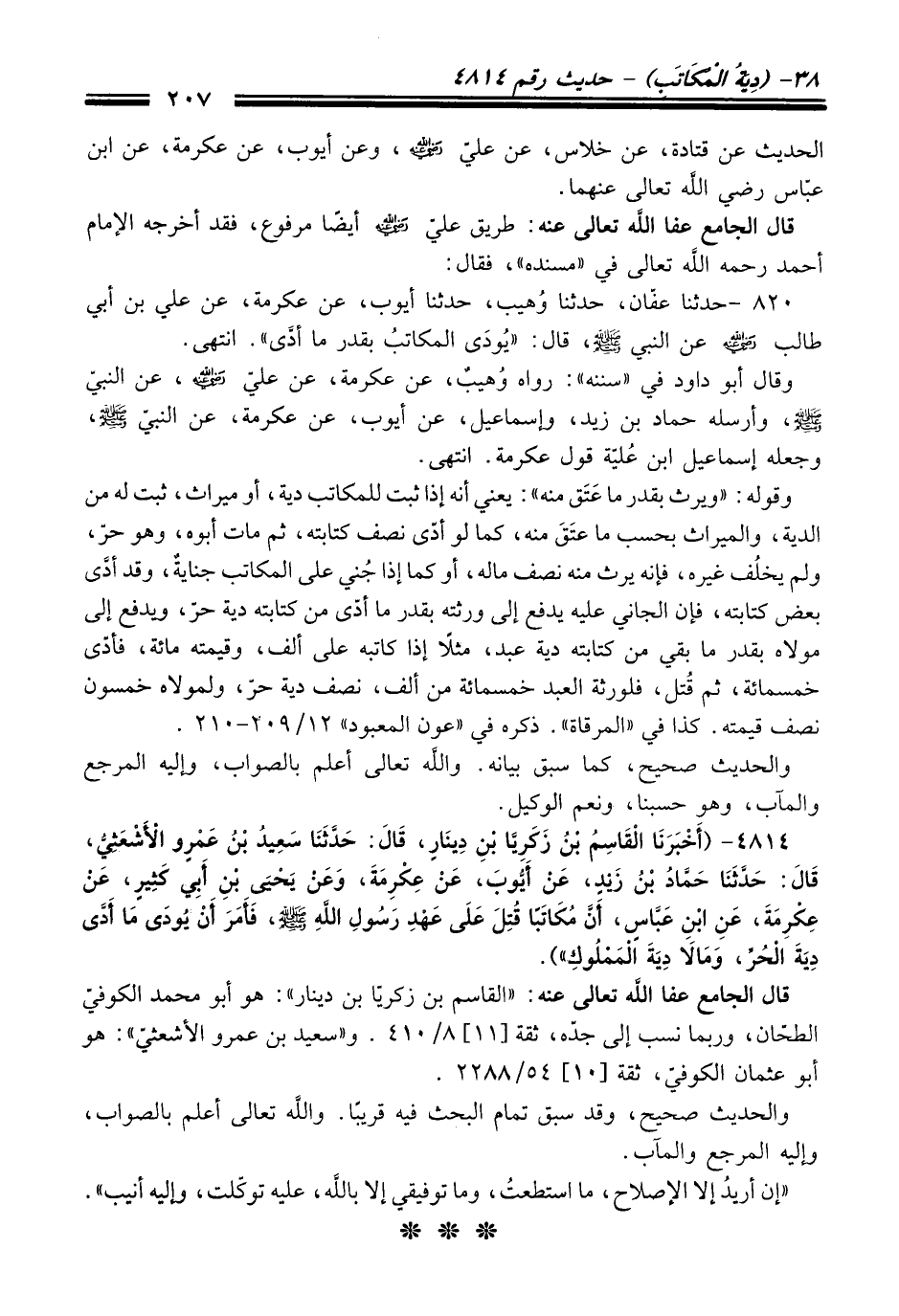 820 - حدثنا عفّان، حدثنا وُهيب، حدثنا أيوب، عن عكرمة، عن علي بن أبي طالب -رضي الله عنه- عن النبيّ -صلى الله عليه وسلم-، قَالَ: "يُودَى المكاتبُ بقدر ما أدى". انتهى.