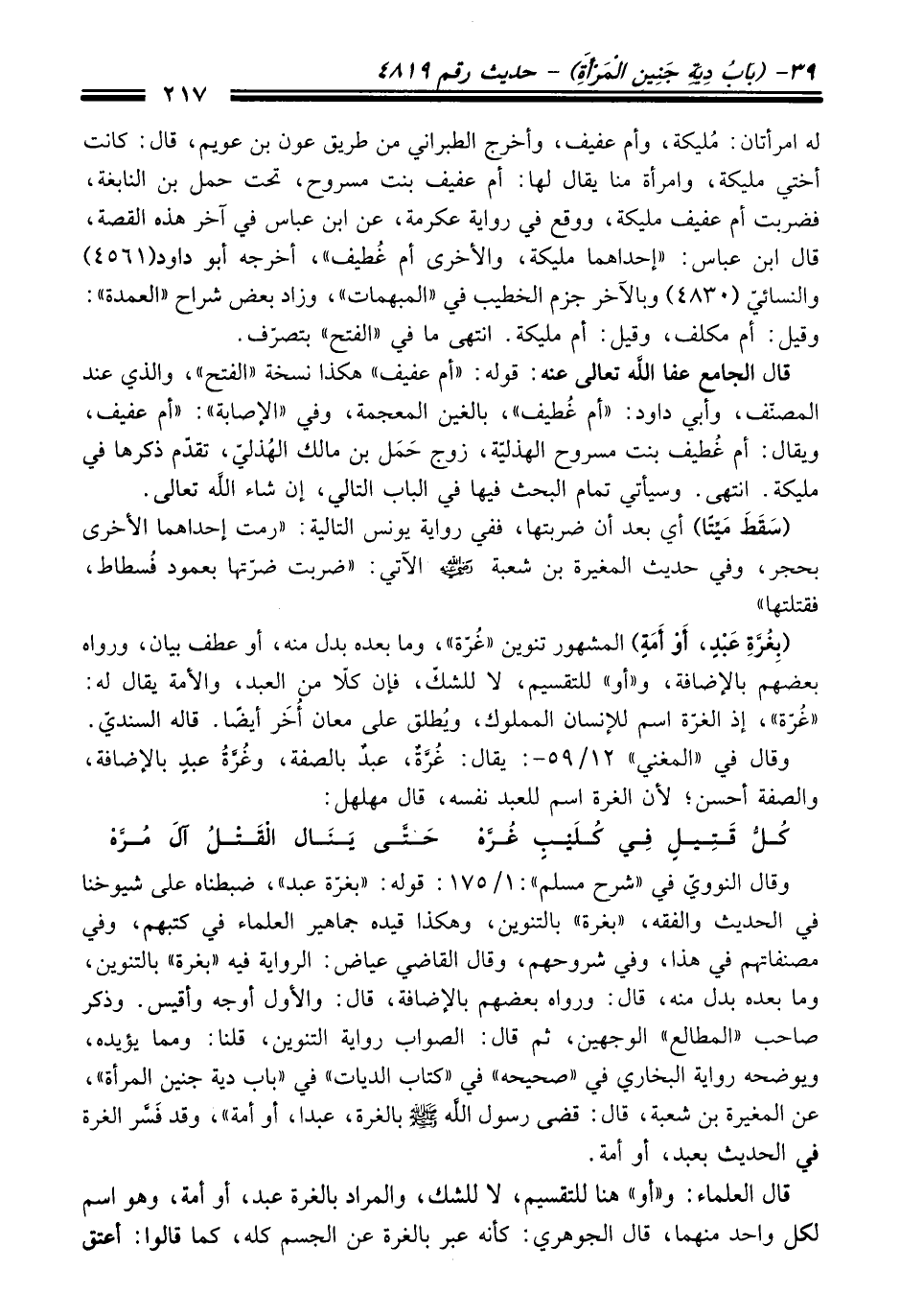 وَقَالَ النوويّ فِي "شرح مسلم": 1/ 175: قوله: "بغرّة عبد"، ضبطناه عَلَى شيوخنا فِي الْحَدِيث والفقه، "بغرة" بالتنوين، وهكذا قيده جماهير العلماء فِي كتبهم، وفي مصنفاتهم فِي هَذَا، وفي شروحهم، وَقَالَ القاضي عياض: الرواية فيه "بغرة" بالتنوين، وما بعده بدل منه، قَالَ: ورواه بعضهم بالإضافة، قَالَ: والأول أوجه وأقيس. وذكر صاحب "المطالع" الوجهين، ثم قَالَ: الصواب رواية التنوين، قلنا: ومما يؤيده، ويوضحه رواية البخاريّ فِي "صحيحه" فِي "كتاب الديات" فِي "باب دية جنين المرأة"، عن المغيرة بن شعبة، قَالَ: قضى رسول الله -صلى الله عليه وسلم- بالغرة، عبدا، أو أمة"، وَقَدْ فَسَّر الغرة فِي الْحَدِيث بعبد، أو أمة.
