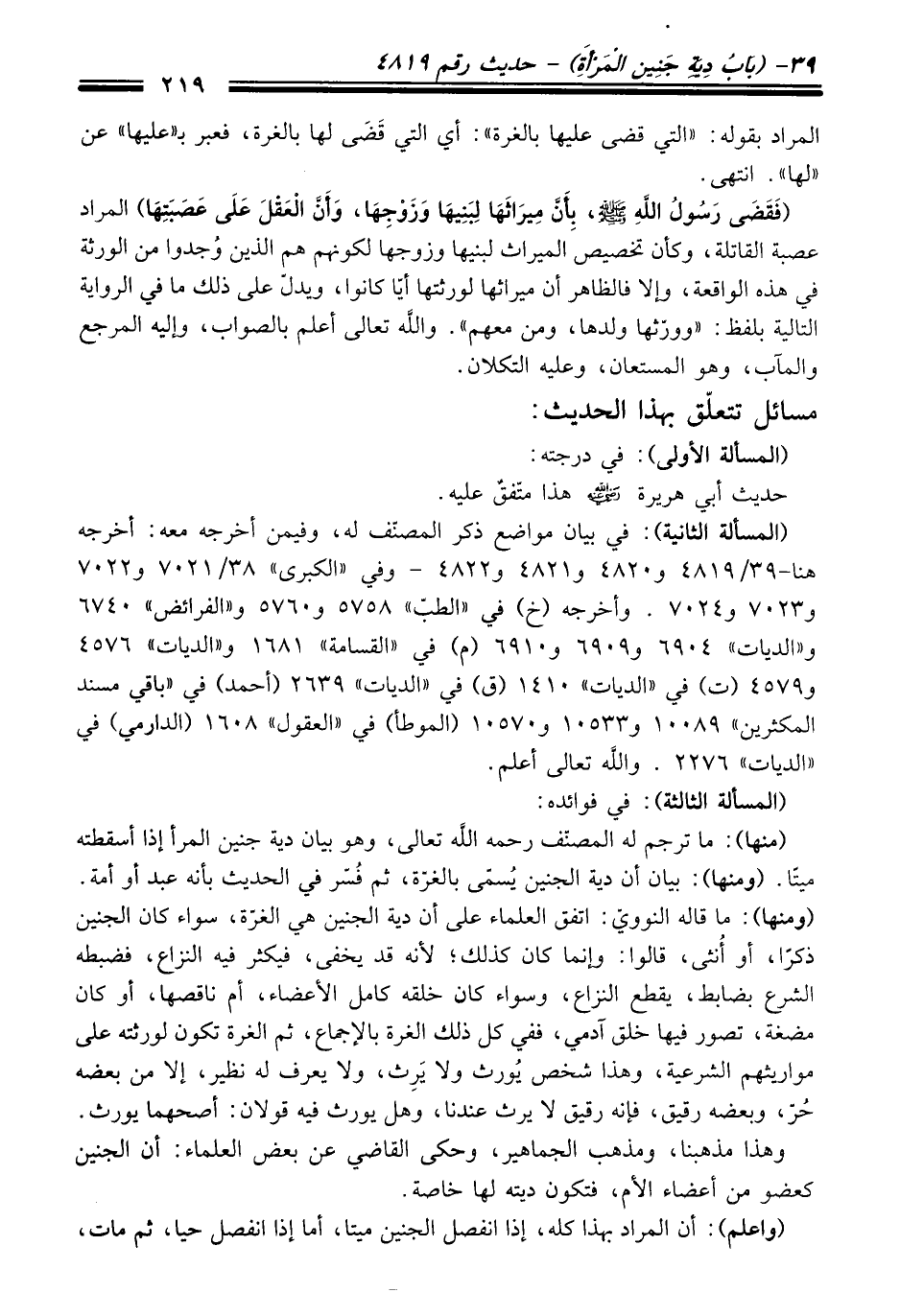 (فَقَضَى رَسُولُ اللَّهِ -صلى الله عليه وسلم-، بِأَنَّ مِيرَاثَهَا لِبَنِيهَا وَزَوْجِهَا، وَأَنَّ الْعَقْلَ عَلَى عَصَبَتِهَا) المراد عصبة القاتلة، وكأن تخصيص الميراث لبنيها وزوجها لكونهم هم الذين وُجدوا منْ الورثة فِي هذه الواقعة، وإلا فالظاهر أن ميراثها لورثتها أيّا كانوا، ويدلّ عَلَى ذلك ما فِي الرواية التالية بلفظ: "وورّثها ولدها، ومن معهم". والله تعالى أعلم بالصواب، وإليه المرجع والمآب، وهو المستعان، وعليه التكلان.