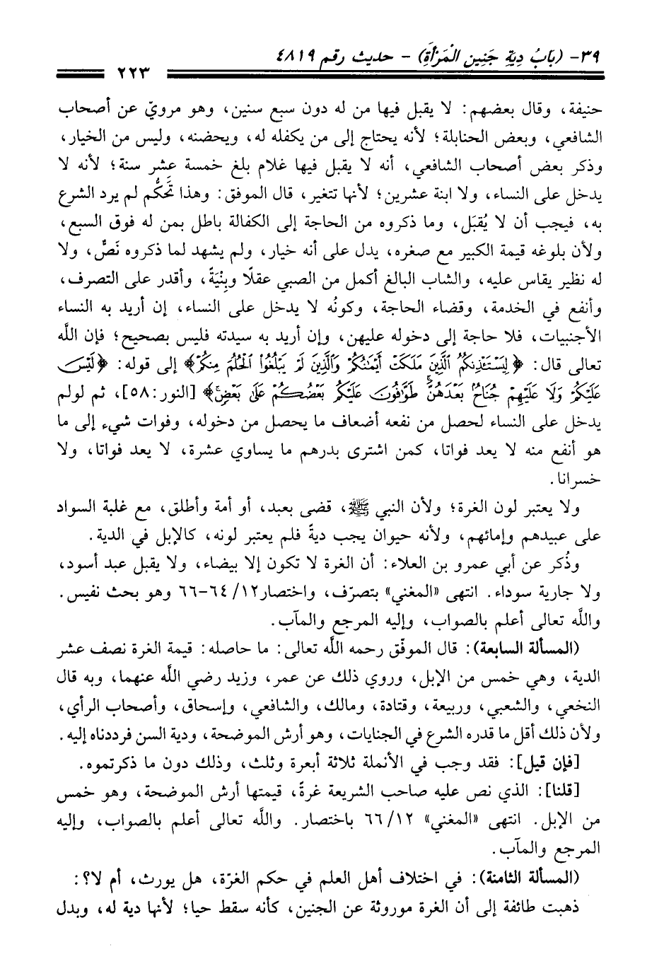 وذُكر عن أبي عمرو بن العلاء: أن الغرة لا تكون إلا بيضاء، ولا يقبل عبد أسود، ولا جارية سوداء. انتهى "المغني" بتصرّف، واختصار 12/ 64 - 66 وهو بحث نفيس. والله تعالى أعلم بالصواب، وإليه المرجع والمآب.