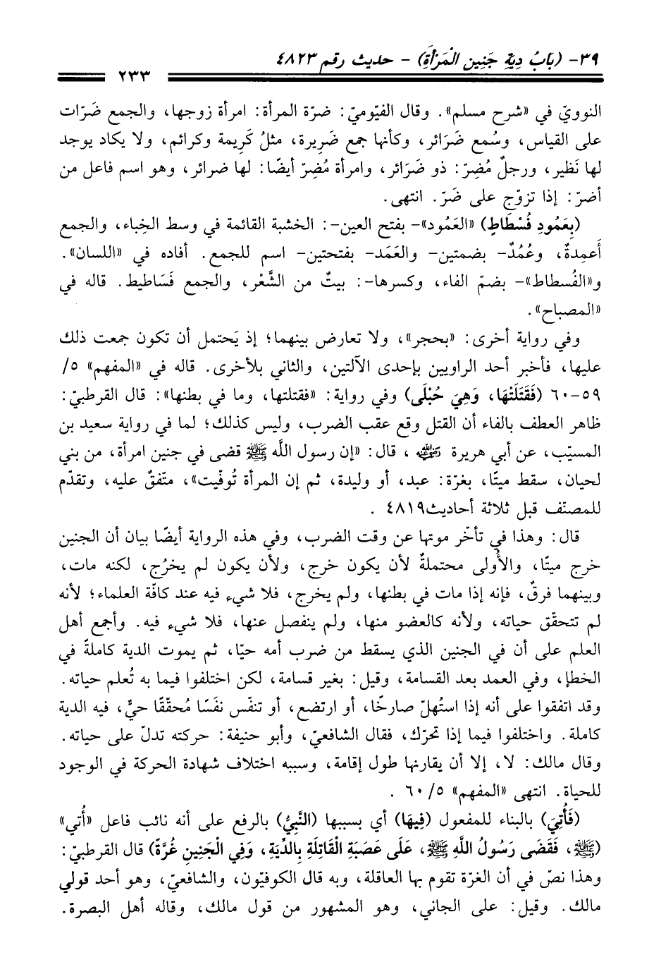 وفي رواية أخرى: "بحجر"، ولا تعارض بينهما؛ إذ يَحتمل أن تكون جمعت ذلك عليها، فأخبر أحد الراويين بإحدى الآلتين، والثاني بلأخرى. قاله فِي "المفهم" 5/ 59 - 60 (فَقَتَلَتْهَا، وَهِيَ حُبْلَى) وفي رواية: "فقتلتها، وما فِي بطنها": قَالَ القرطبيّ: ظاهر العطف بالفاء أن القتل وقع عقب الضرب، وليس كذلك، لما فِي رواية سعيد بن المسيب، عن أبي هريرة -رضي الله عنه-، قَالَ: "إن رسول الله -صلى الله عليه وسلم- قضى فِي جنين امرأة، منْ بني لحيان، سقط ميتًا، بغرّة: عبد، أو وليدة، ثم إن المرأة تُوفّيت"، متَّفقٌ عليه، وتقدّم للمصنّف قبل ثلاثة أحاديث 4819.