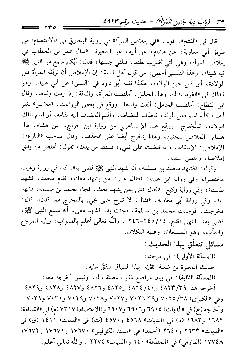 قَالَ فِي "الفتح": قوله: "فِي إملاص المرأة" فِي رواية البخاريّ فِي "الاعتصام" منْ طريق أبي معاوية، عن هشام، عن أبيه، عن المغيرة: "سأل عمر بن الخطاب فِي إملاص المرأة، وهي التي تُضرب بطنها، فتلقي جنينها، فَقَالَ: أيُّكم سمع منْ النبيّ -صلى الله عليه وسلم- فيه شيئا"، وهذا التفسير أخص، منْ قول أهل اللغة: إن الإملاص أن تُزلِقَه المرأة قبل الولادة، أي قبل حين الولادة، هكذا نقله أبو داود فِي "السنن" عن أبي عبيد، وهو كذلك فِي "الغريب" له، وَقَالَ الخليل: أملصت المرأة، والناقة: إذا رمت ولدها. وَقَالَ ابن القطاع: أملصت الحامل: ألقت ولدها. ووقع فِي بعض الروايات: "ملاص" بغير ألف، كأنه اسم فعل الولد، فحذف المضاف، وأقيم المضاف إليه مقامه، أو اسم لتلك الولادة، كالْخِدَاج. ووقع عند الإسماعيلي منْ رواية ابن جريج، عن هشام، قَالَ هشام: الملاص للجنين، وهذا يتخرج أيضا عَلَى الحذف، وَقَالَ صاحب "البارع": الإملاص: الإسقاط، وإذا قبضت عَلَى شيء، فسقط منْ يدك، تقول: أملص منْ يدي إملاصا، وملص ملصا.