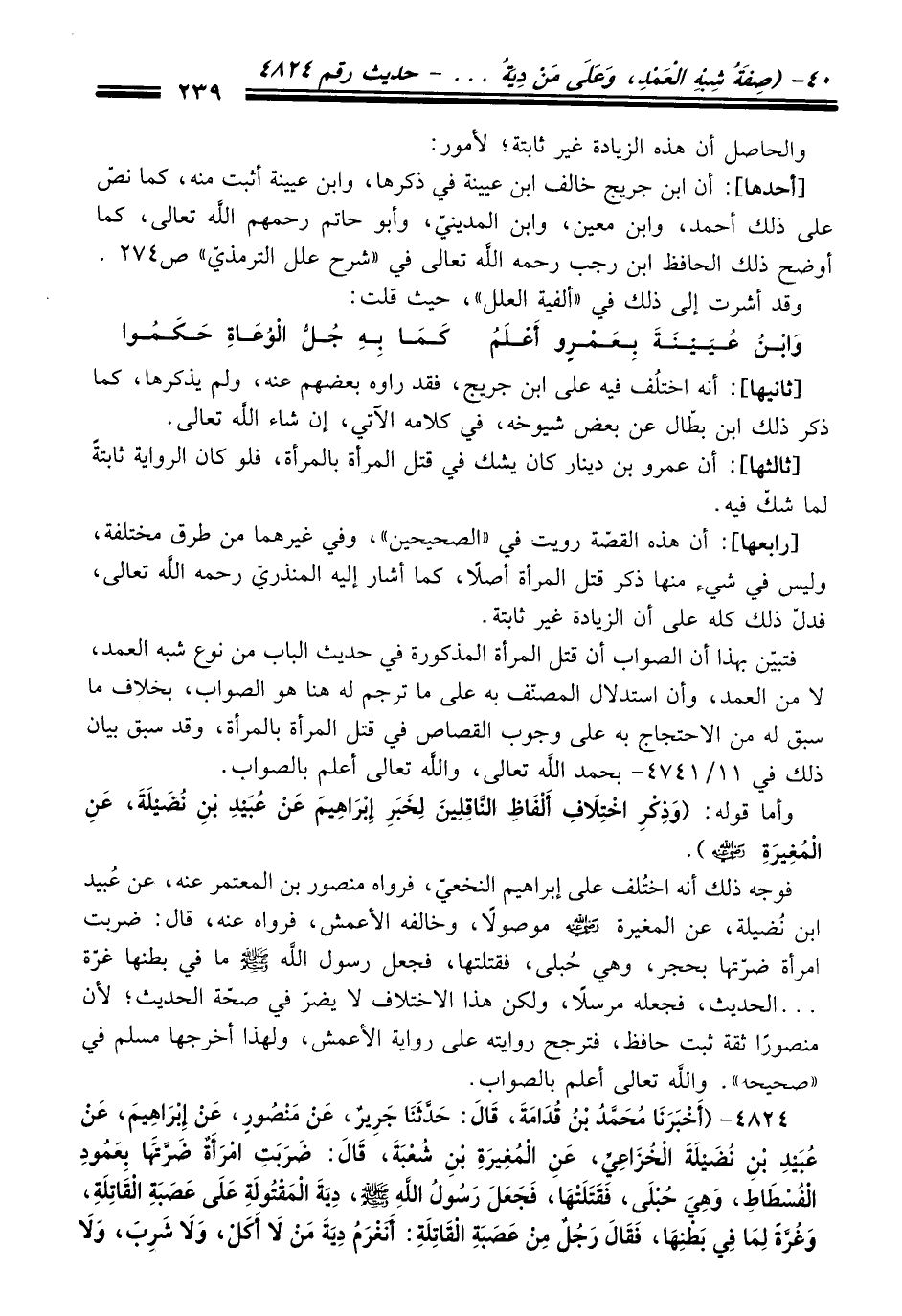 فتبيّن بهذا أن الصواب أن قتل المرأة المذكورة فِي حديث الباب منْ نوع شبه العمد، لا منْ العمد، وأن استدلال المصنّف به عَلَى ما ترجم له هنا هو الصواب، بخلاف ما سبق له منْ الاحتجاج به عَلَى وجوب القصاص فِي قتل المرأة بالمرأة، وَقَدْ سبق بيان ذلك فِي 11/ 4741 - بحمد الله تعالى، والله تعالى أعلم بالصواب.