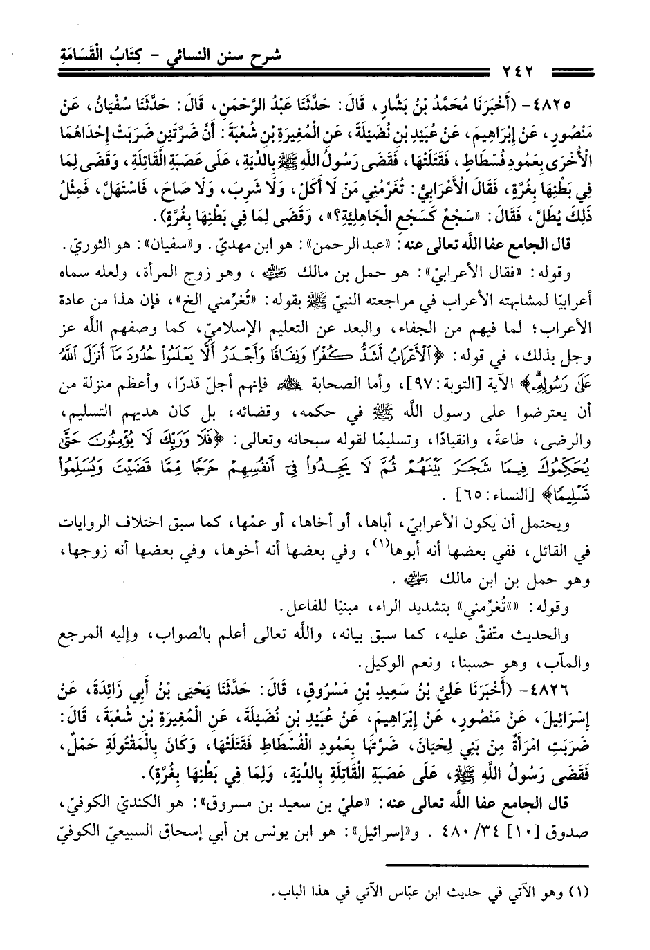 4825 - (أَخْبَرَنَا مُحَمَّدُ بْنُ بَشَّارٍ، قَالَ: حَدَّثَنَا عَبْدُ الرَّحْمَنِ، قَالَ: حَدَّثَنَا سُفْيَانُ، عَنْ مَنْصُورٍ، عَنْ إِبْرَاهِيمَ، عَنْ عُبَيْدِ بْنِ نُضَيْلَةَ، عَنِ الْمُغِيرَةِ بْنِ شُعْبَةَ: أَنَّ ضَرَّتَيْنِ ضَرَبَتْ إِحْدَاهُمَا الأُخْرَى بِعَمُودِ فُسْطَاطٍ، فَقَتَلَتْهَا، فَقَضَى رَسُولُ اللَّهِ -صلى الله عليه وسلم- بِالدِّيَةِ، عَلَى عَصَبَةِ الْقَاتِلَةِ، وَقَضَى لِمَا فِي بَطْنِهَا بِغُرَّةٍ، فَقَالَ الأَعْرَابِيُّ: تُغَرِّمُنِي مَنْ لاَ أَكَلْ، وَلاَ شَرِبَ، وَلاَ صَاحَ، فَاسْتَهَلّ، فَمِثْلُ ذَلِكَ يُطَلّ، فَقَالَ: "سَجْعٌ كَسَجْعِ الْجَاهِلِيَّةِ؟ "، وَقَضَى لِمَا فِي بَطْنِهَا بِغُرَّةٍ).