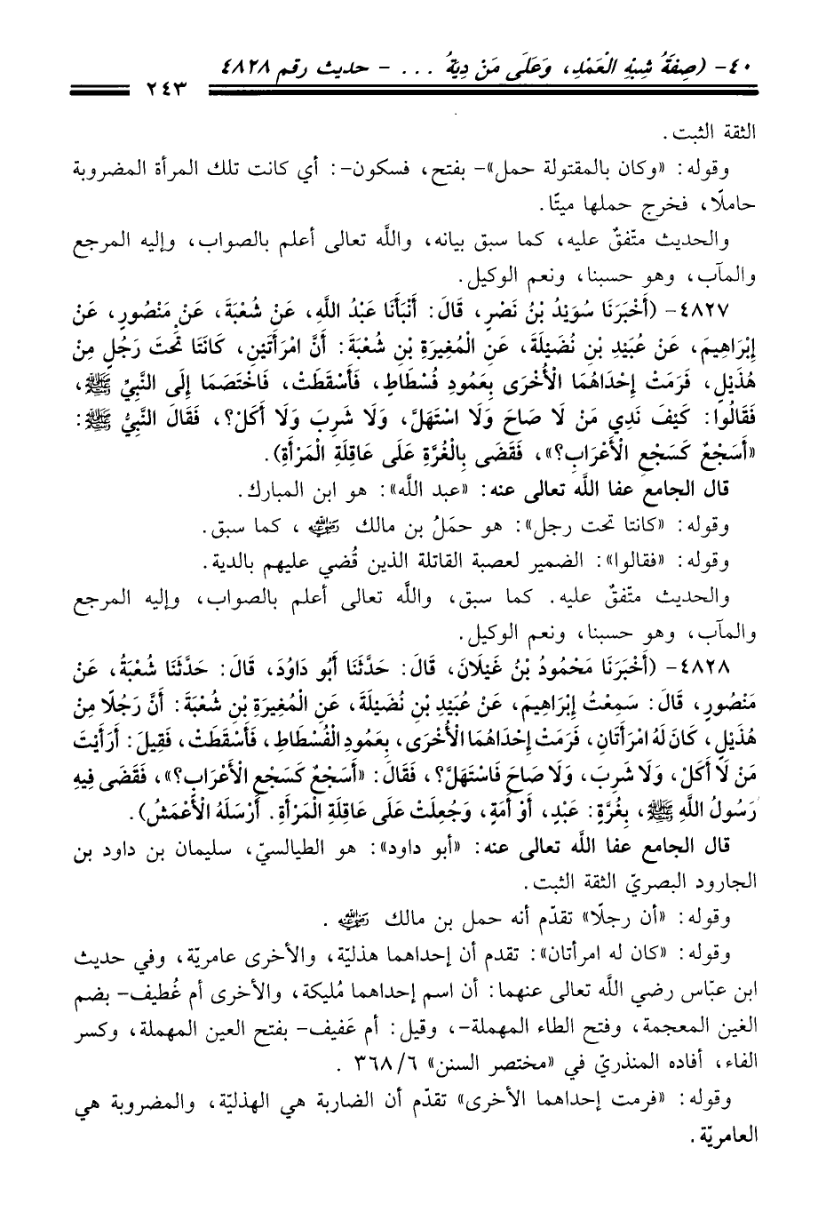 4827 - (أَخْبَرَنَا سُوَيْدُ بْنُ نَصْرٍ، قَالَ: أَنْبَأَنَا عَبْدُ اللَّهِ، عَنْ شُعْبَةَ، عَنْ مَنْصُورٍ، عَنْ إِبْرَاهِيمَ، عَنْ عُبَيْدِ بْنِ نُضَيْلَةَ، عَنِ الْمُغِيرَةِ بْنِ شُعْبَةَ: أَنَّ امْرَأَتَيْنِ، كَانَتَا تَحْتَ رَجُلٍ مِنْ هُذَيْلٍ، فَرَمَتْ إِحْدَاهُمَا الأُخْرَى بِعَمُودِ فُسْطَاطٍ، فَأَسْقَطَتْ فَاخْتَصَمَا إِلَى النَّبِيِّ -صلى الله عليه وسلم-، فَقَالُوا: كَيْفَ نَدِي مَنْ لاَ صَاحَ وَلاَ اسْتَهَلّ، وَلاَ شَرِبَ وَلاَ أَكَلْ؟ فَقَالَ النَّبِيُّ -صلى الله عليه وسلم-: "أَسَجْعٌ كَسَجْعِ الأَعْرَابِ؟ "، فَقَضَى بِالْغُرَّةِ عَلَى عَاقِلَةِ الْمَرْأَةِ).