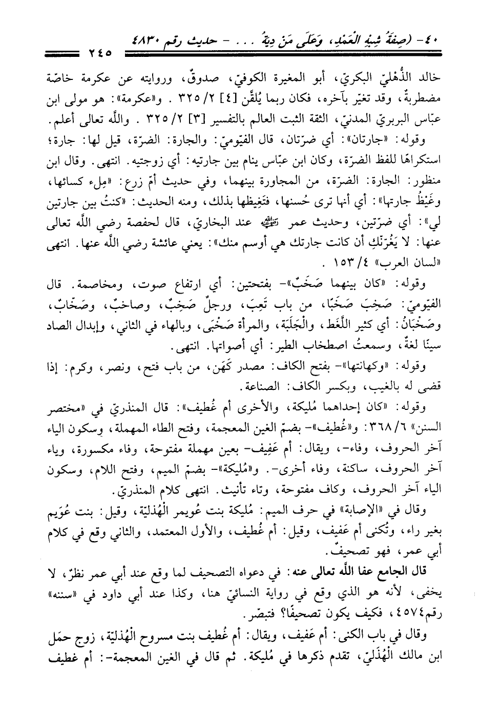 قَالَ الجامع عفا الله تعالى عنه: فِي دعواه التصحيف لما وقع عند أبي عمر نظرٌ، لا يخفى، لأنه هو الذي وقع فِي رواية النسائيّ هنا، وكذا عند أبي داود فِي "سننه" رقم 4574، فكيف يكون تصحيفًا؟ فتبصّر.