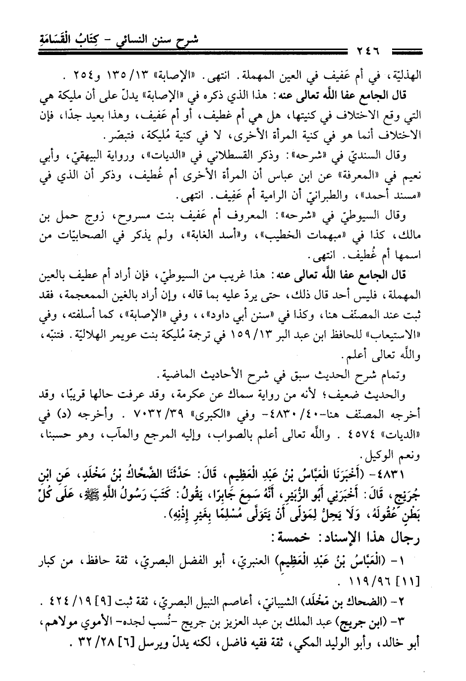 والحديث ضعيف؛ لأنه منْ رواية سماك عن عكرمة، وَقَدْ عرفت حالها قريبًا، وَقَدْ أخرجه المصنّف هنا -40/ 4835 - وفي "الكبرى" 39/ 7032. وأخرجه (د) فِي "الديات" 4574. والله تعالى أعلم بالصواب، وإليه المرجع والمآب، وهو حسبنا، ونعم الوكيل.