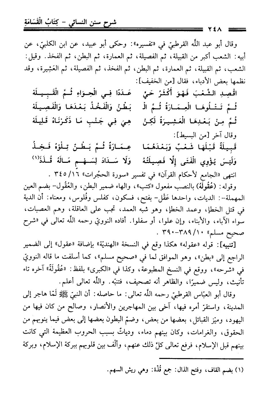 وَقَالَ أبو عبد الله القرطبيّ فِي "تفسيره": وحكى أبو عبيد، عن ابن الكلبيّ، عن أبيه: الشعب أكبر منْ القبيلة، ثم الفصيلة، ثم العمارة، ثم البطن، ثم الفخذ. وقيل: الشعب، ثم القبيلة، ثم العمارة، ثم البطن، ثم الفخذ، ثم الفصيلة، ثم العَشِيرة، وَقَدْ نظمها بعض الأدباء، فَقَالَ [منْ الخفيف]: