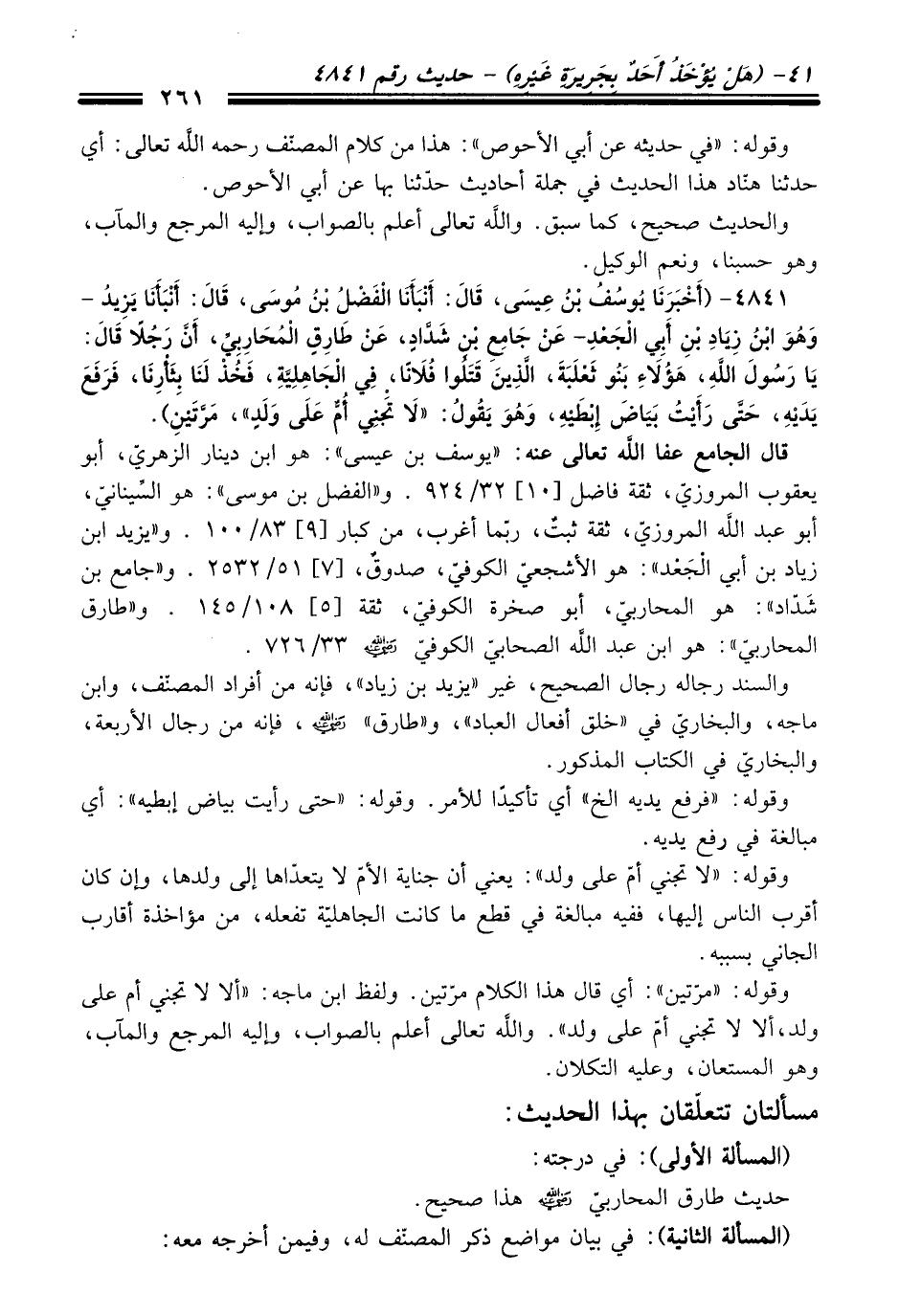 قَالَ الجامع عفا الله تعالى عنه: "يوسف بن عيسى": هو ابن دينار الزهريّ، أبو يعقوب المروزيّ، ثقة فاضل [10] 32/ 924. و"الفضل بن موسى": هو السِّينانيّ، أبو عبد الله المروزيّ، ثقة ثبتٌ، ربّما أغرب، منْ كبار [9] 83/ 100. و"يزيد ابن زياد بن أبي الْجَعْد": هو الأشجعيّ الكوفيّ، صدوقٌ، [7] 51/ 2532. و"جامع بن شَدّاد": هو المحاربيّ، أبو صخرة الكوفيّ، ثقة [5] 108/ 145. و"طارق المحاربيّ": هو ابن عبد الله الصحابيّ الكوفيّ -رضي الله عنه- 33/ 726.
