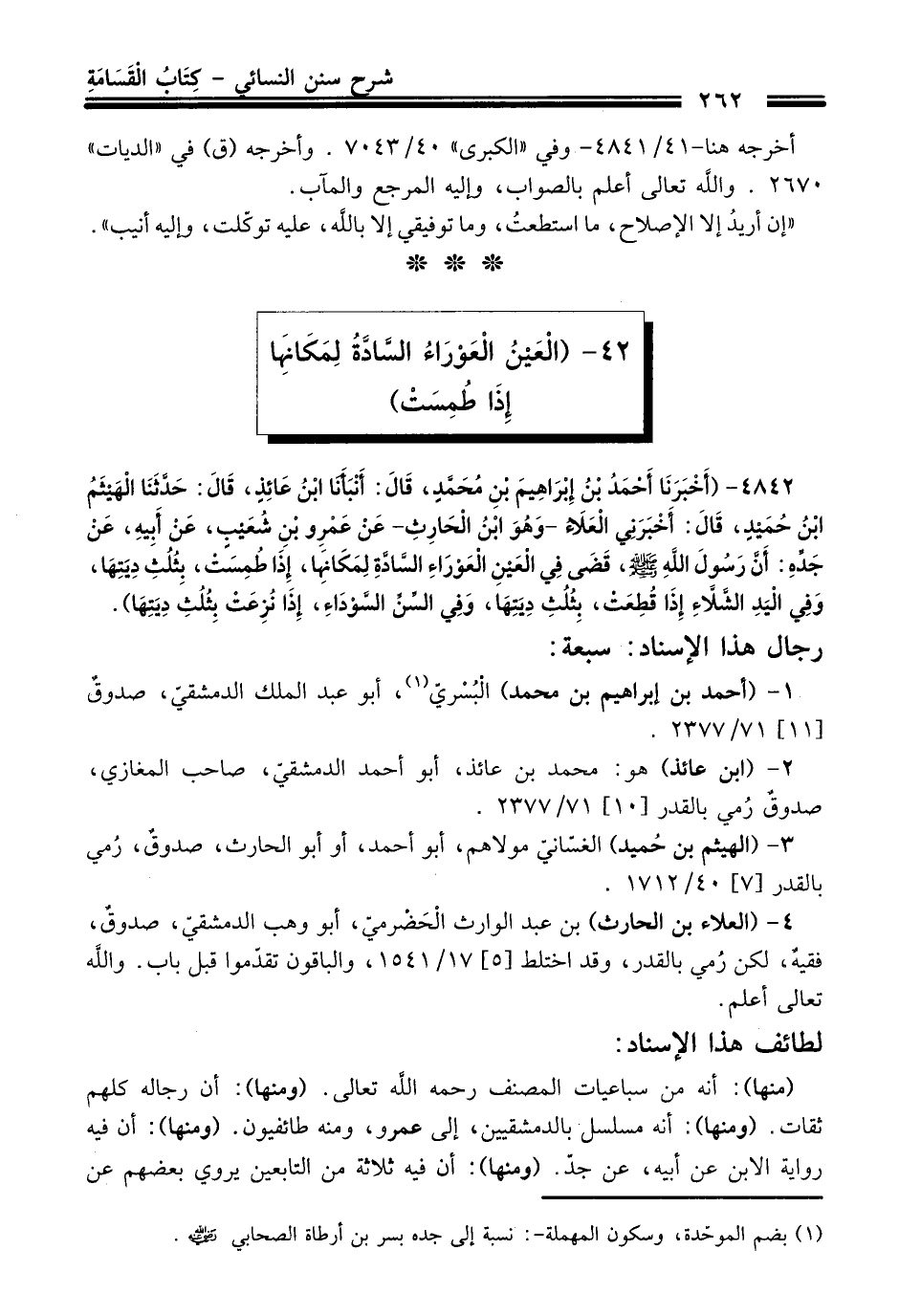 4842 - (أَخْبَرَنَا أَحْمَدُ بْنُ إِبْرَاهِيمَ بْنِ مُحَمَّدٍ، قَالَ: أَنْبَأَنَا ابْنُ عَائِذٍ، قَالَ: حَدَّثَنَا الْهَيْثَمُ بْنُ حُمَيْدٍ، قَالَ: أَخْبَرَنِي الْعَلاَءُ -وَهُوَ ابْنُ الْحَارِثِ- عَنْ عَمْرِو بْنِ شُعَيْبٍ، عَنْ أَبِيهِ، عَنْ جَدِّهِ: أَنَّ رَسُولَ اللَّهِ -صلى الله عليه وسلم-، قَضَى فِي الْعَيْنِ الْعَوْرَاءِ السَّادَّةِ لِمَكَانِهَا، إِذَا طُمِسَتْ، بِثُلُثِ دِيَتِهَا، وَفِى الْيَدِ الشَّلاَّءِ إِذَا قُطِعَتْ، بِثُلُثِ دِيَتِهَا، وَفِى السِّنِّ السَّوْدَاءِ، إِذَا نُزِعَتْ بِثُلُثِ دِيَتِهَا).