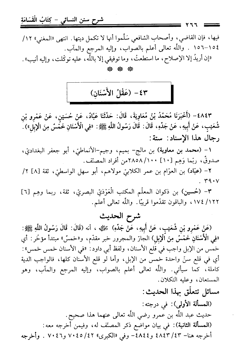 4843 - (أَخْبَرَنَا مُحَمَّدُ بْنُ مُعَاوِيَةَ، قَالَ: حَدَّثَنَا عَبَّادٌ، عَنْ حُسَيْنٍ، عَنْ عَمْرِو بْنِ شُعَيْبٍ، عَنْ أَبِيهِ، عَنْ جَدِّهِ، قَالَ: قَالَ رَسُولُ اللَّهِ -صلى الله عليه وسلم-: "فِي الأَسْنَانِ خَمْسٌ مِنَ الإِبِلِ").