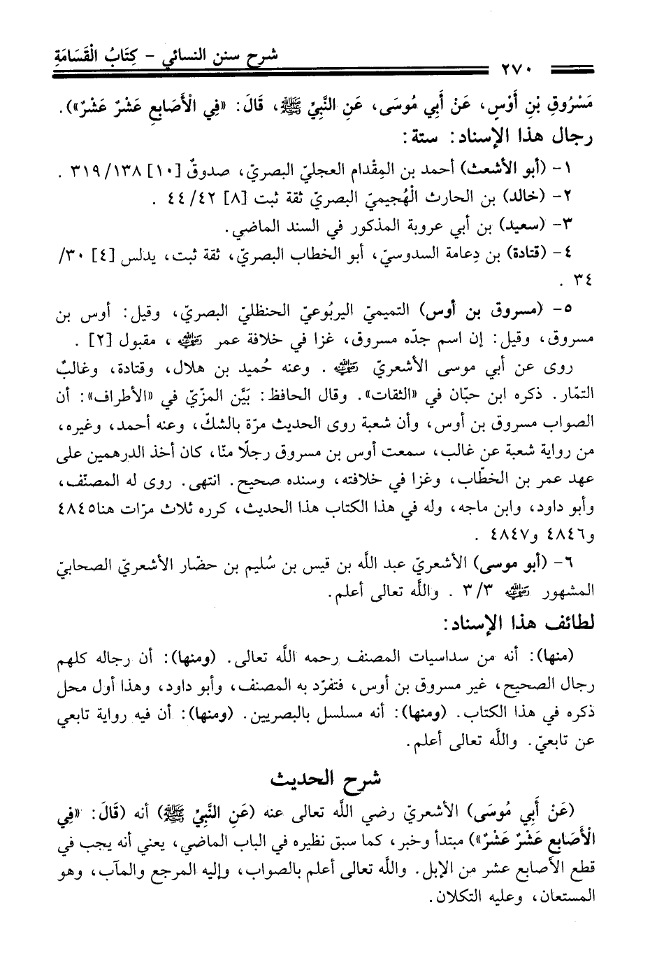 مَسْرُوقِ بْنِ أَوْسٍ، عَنْ أَبِي مُوسَى، عَنِ النَّبِيِّ -صلى الله عليه وسلم-، قَالَ: "فِي الأَصَابِعِ عَشْرٌ عَشْرٌ").