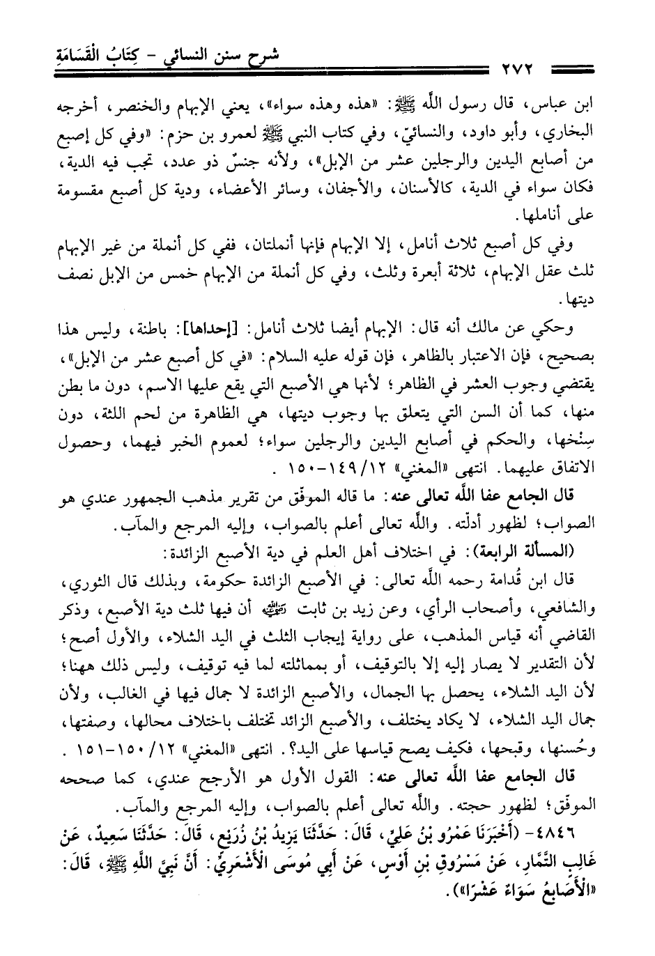 وحكي عن مالك أنه قَالَ: الإبهام أيضا ثلاث أنامل: [إحداها]: باطنة، وليس هَذَا بصحيح، فإن الاعتبار بالظاهر، فإن قوله عليه السلام: "فِي كل أصبع عشر منْ الإبل"، يقتضي وجوب العشر فِي الظاهر؛ لأنها هي الأصبع التي يقع عليها الاسم، دون ما بطن منها، كما أن السن التي يتعلق بها وجوب ديتها، هي الظاهرة منْ لحم اللثة، دون سِنْخها، والحكم فِي أصابع اليدين والرجلين سواء؛ لعموم الخبر فيهما، وحصول الاتفاق عليهما. انتهى "المغني" 12/ 149 - 150.